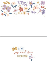 Greeting card with envelope Sweet baby girl Love joy and fun Congrats! Embellished with foil Folded size: 4.25" x 5.5" (A2). Proudly made in the U.S.A.