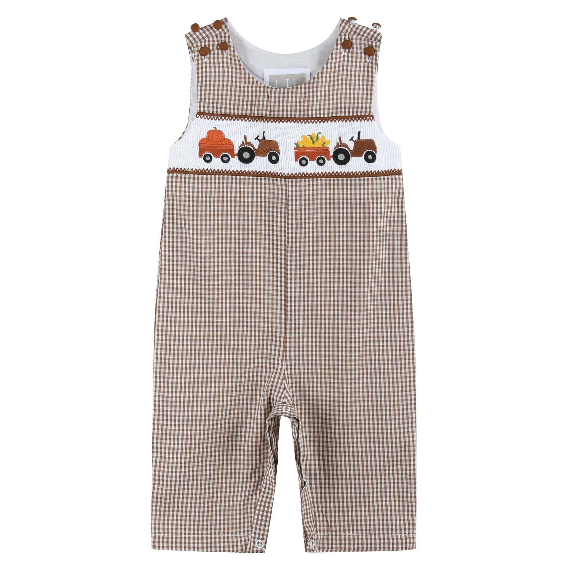 Brown Gingham Pumpkin and Corn Tractor Smocked Overalls