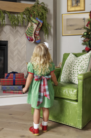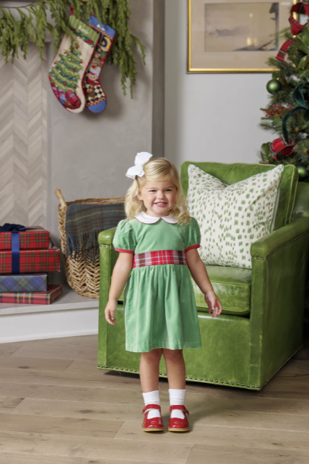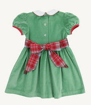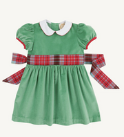 Our Cindy Lou Sash Dress in Kiawah Kelly Green Corduroy with Worth Avenue White collar & Wilson Pier Plaid is the perfect party dress for your little lady! This dress combines charm and cheer, making it a standout choice for a magical season.