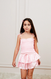 Meet the Willow—a charming skort that looks like a mini skirt but delivers practical shorts underneath! Featuring a smocked waist and delicate satin bow tie, this piece combines style with everyday wearability. The silky satin fabric feels luxurious against your skin, while hidden ruffles and shorts keep you comfortable and confident. Pair it with one of our matching tops for a complete look that makes you feel absolutely special!