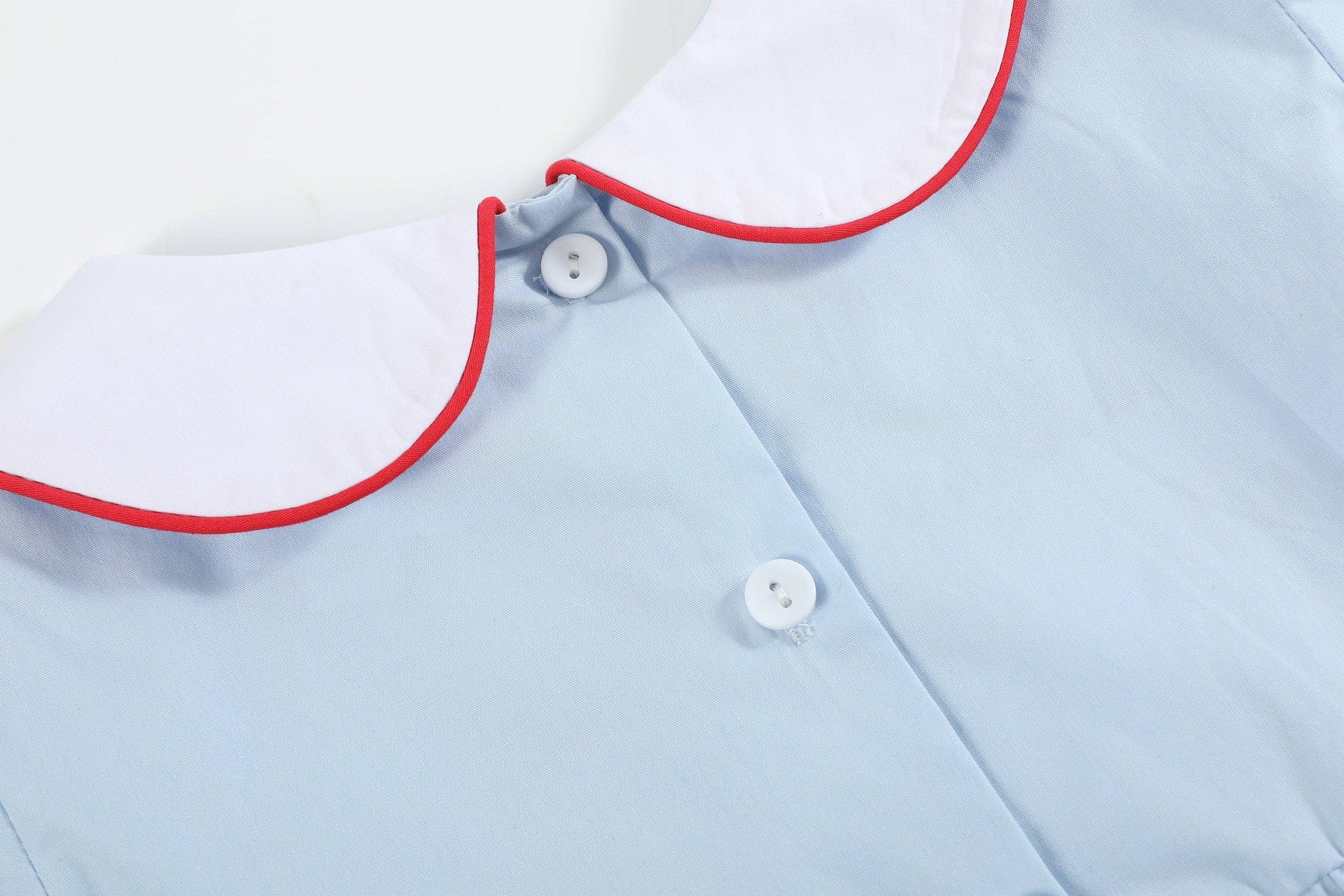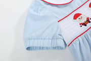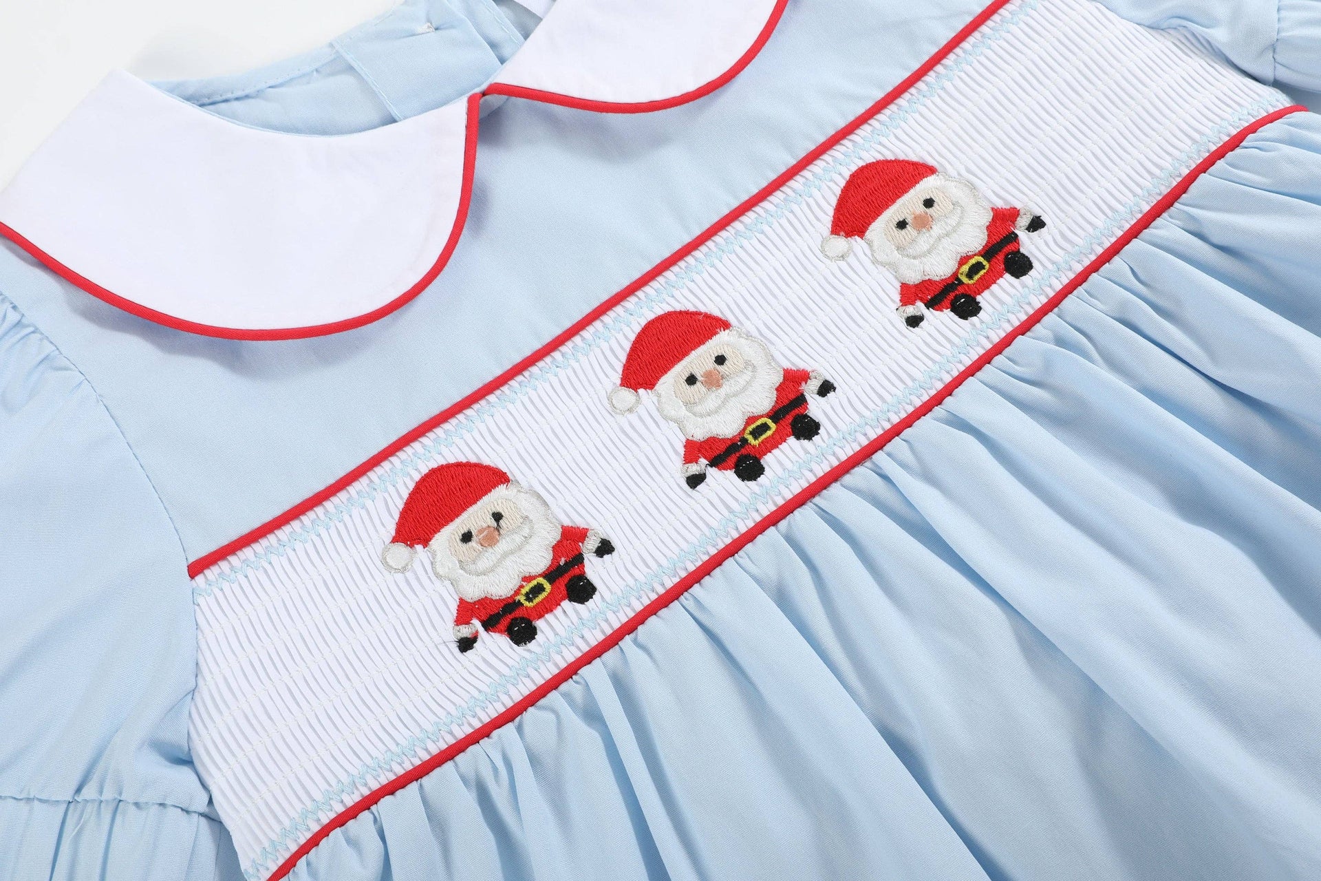 This Light Blue Santa Smocked Dress is a cozy and charming choice for the holiday season. The smocked bodice is embroidered with festive Santas, adding a playful touch. Made from 100% cotton, the dress is both warm and breathable. Piping trim on the collar enhances its classic appeal, while the tie bow on the back and back buttons ensure easy wear. Perfect for winter gatherings and celebrations.