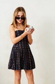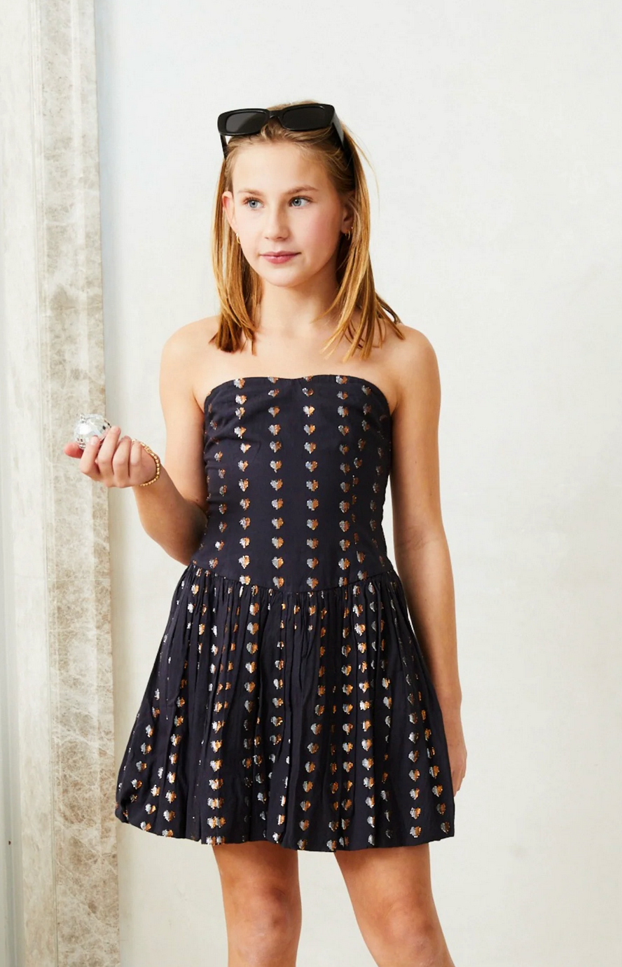 Meet the Daniela—a dreamy bubble dress that's pure romance! Covered in shimmering silver and gold lurex hearts against a classic black backdrop, this piece is undeniably girly and utterly gorgeous. The flattering bubble silhouette hugs you in all the right ways, making everyone feel like their best self. It's the kind of special dress that turns everyday moments into something magical. You're going to absolutely love it!