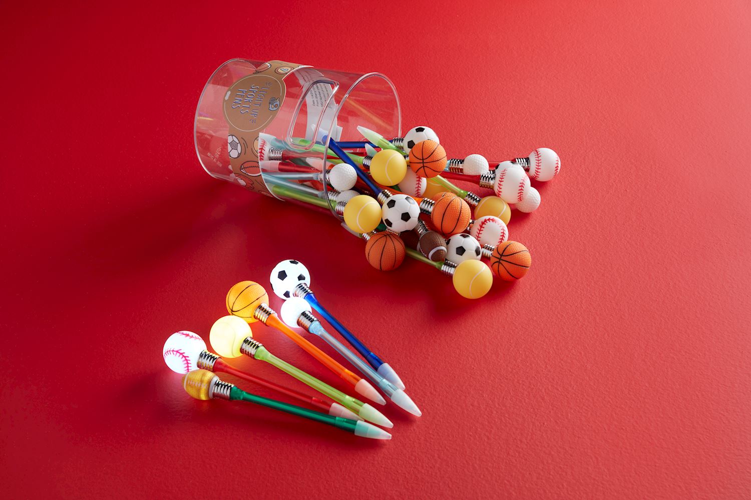These Sports Light-Up Pens feature a unique ball topper that illuminates each time you doodle, adding fun and creativity to your writing experience. Suitable for ages 3 and up, they come neatly packaged in a clear acrylic display bucket for easy storage and presentation. Perfect for engaging young artists and brightening up any workspace with a touch of interactive flair.