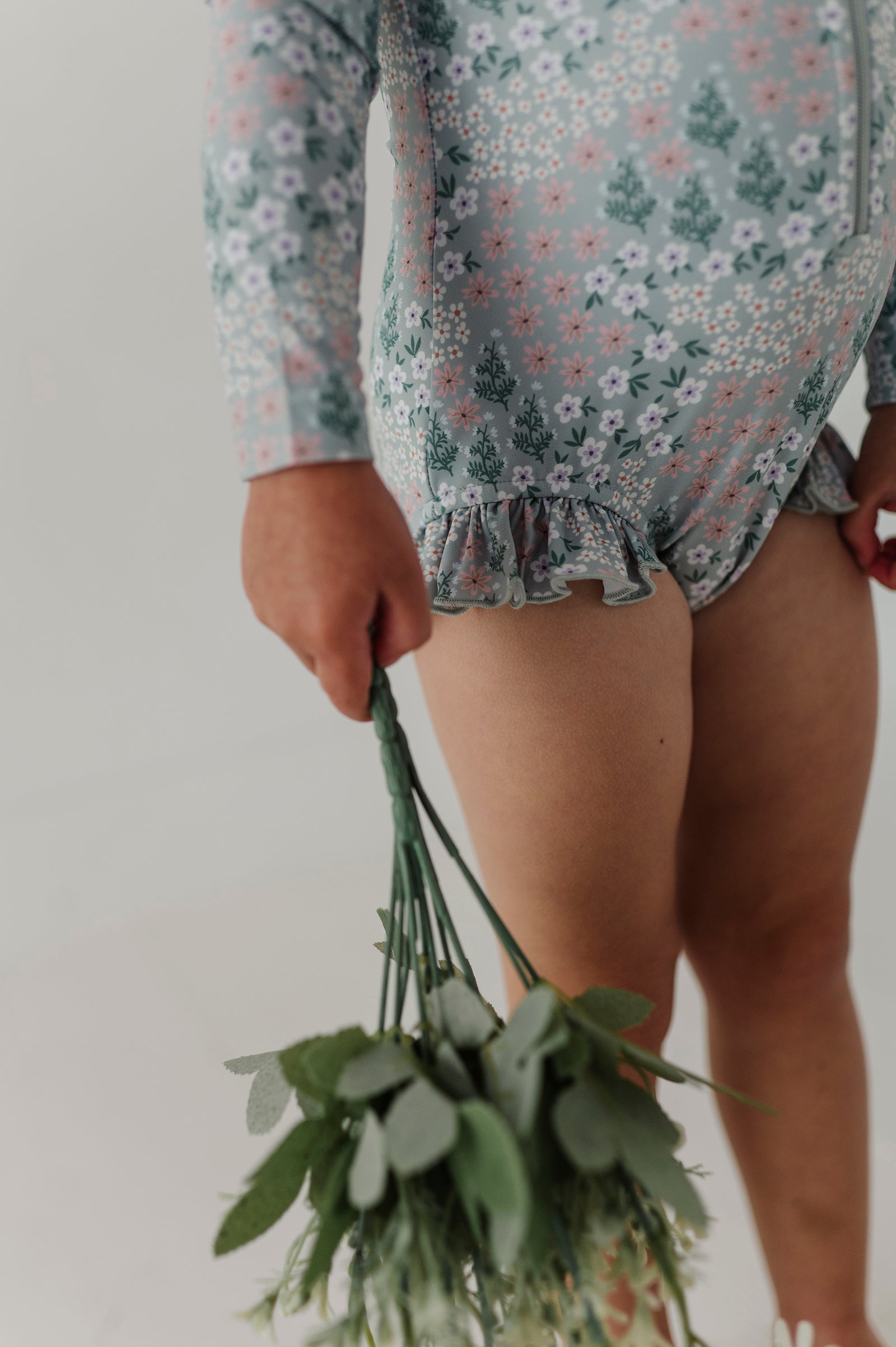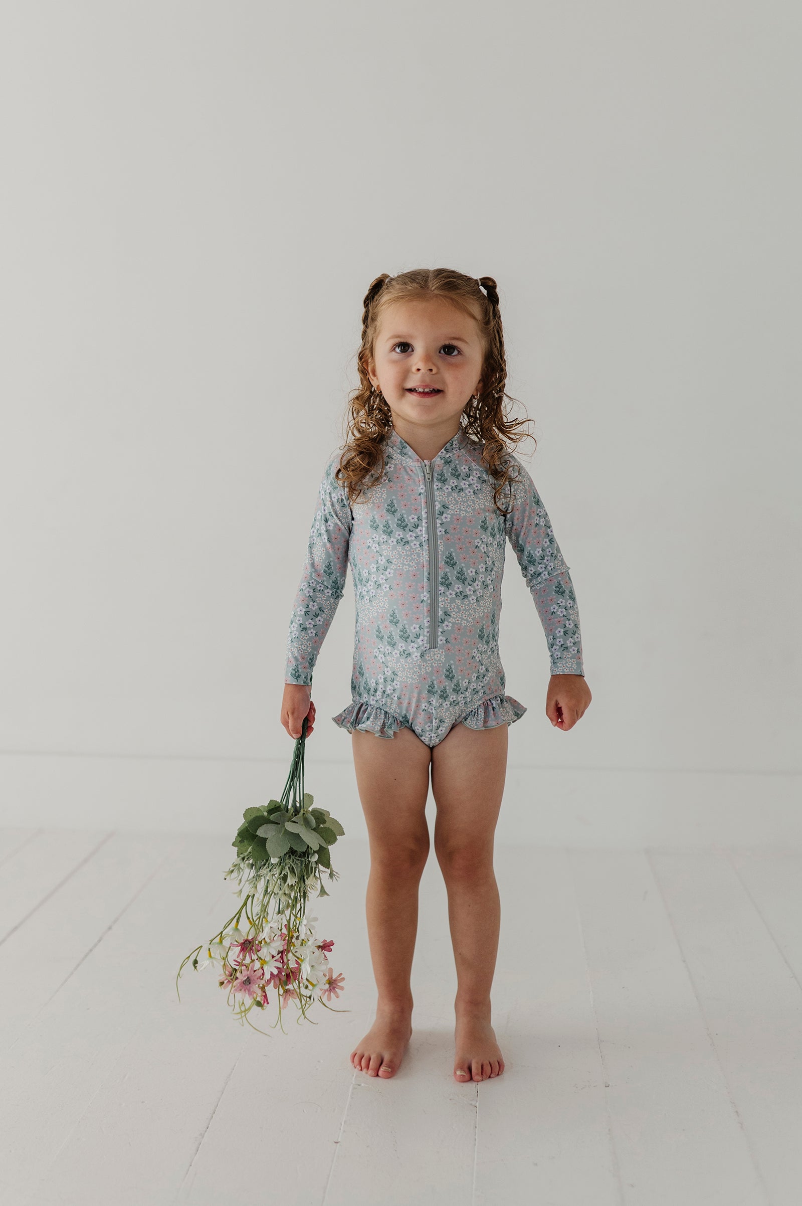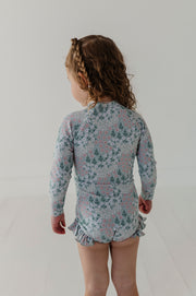 Girl's One-Piece Ruffle Rash Guard Swimsuit | Aqua Grey Floral