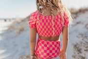 Girls hot pink and tangerine checkered print Print puff sleeve ruched shirred two piece swimsuit with ruffle accents. SPF 50. Double Lined Throughout. High quality FULL Ruffles! Perfect for spring & summer swims! All of our swimsuits are unique, one-of-kind designs to delight your child. They are fade resistant for multiple seasons of wear. Bottoms are made modest for full coverage with good elastic in legs that will not loosen over time. Wash on gentle cycle cold wash, hang dry. 85% Polyester, 15% Spandex