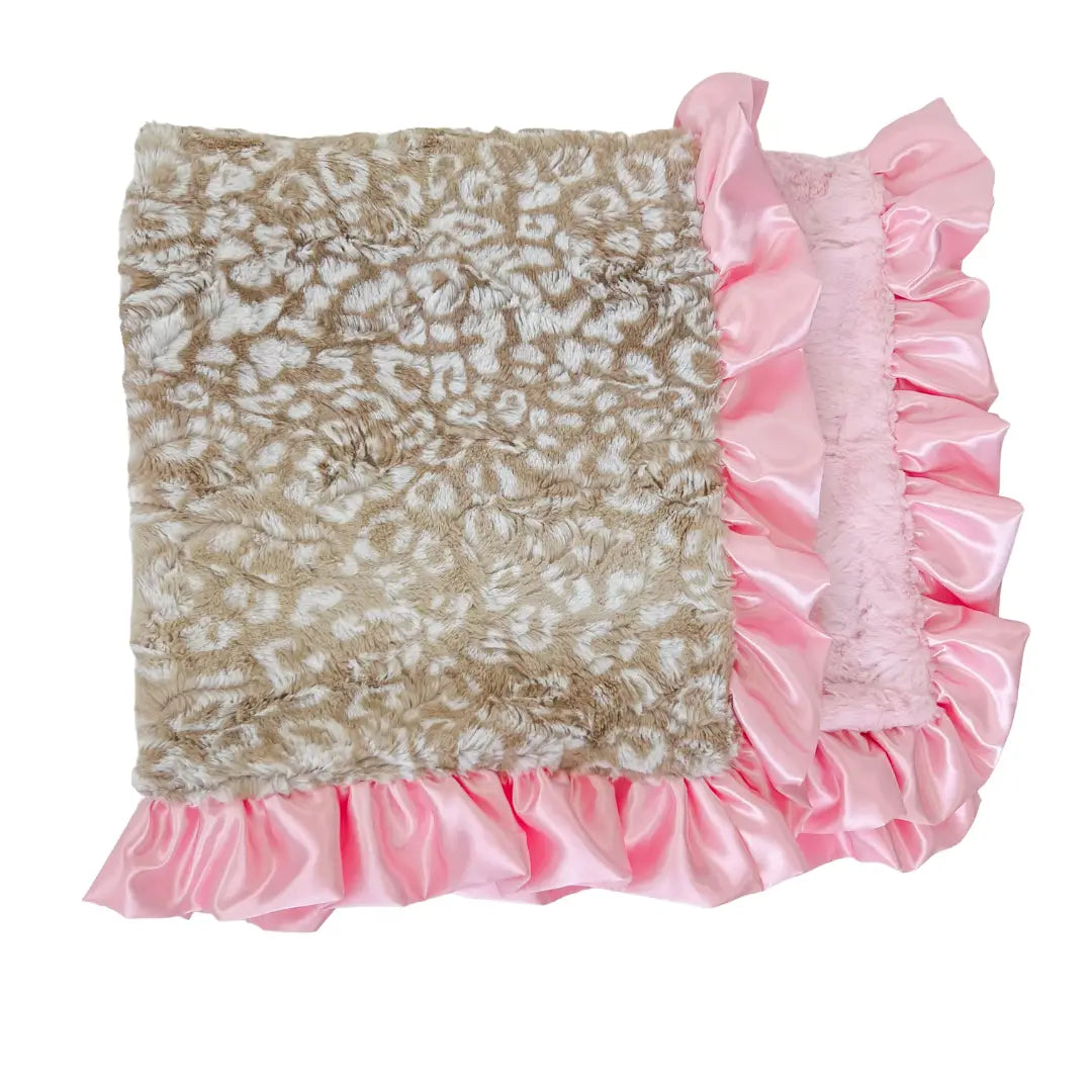 This luxurious plush blanket has soft faux fur on both sides and is framed with a silky satin ruffle. It measures approximately 34" X 34" and is made in the USA.