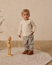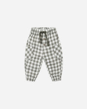 Comfortable woven pants with an elastic waistband and leg openings, adjustable drawstring, and side patch pockets.