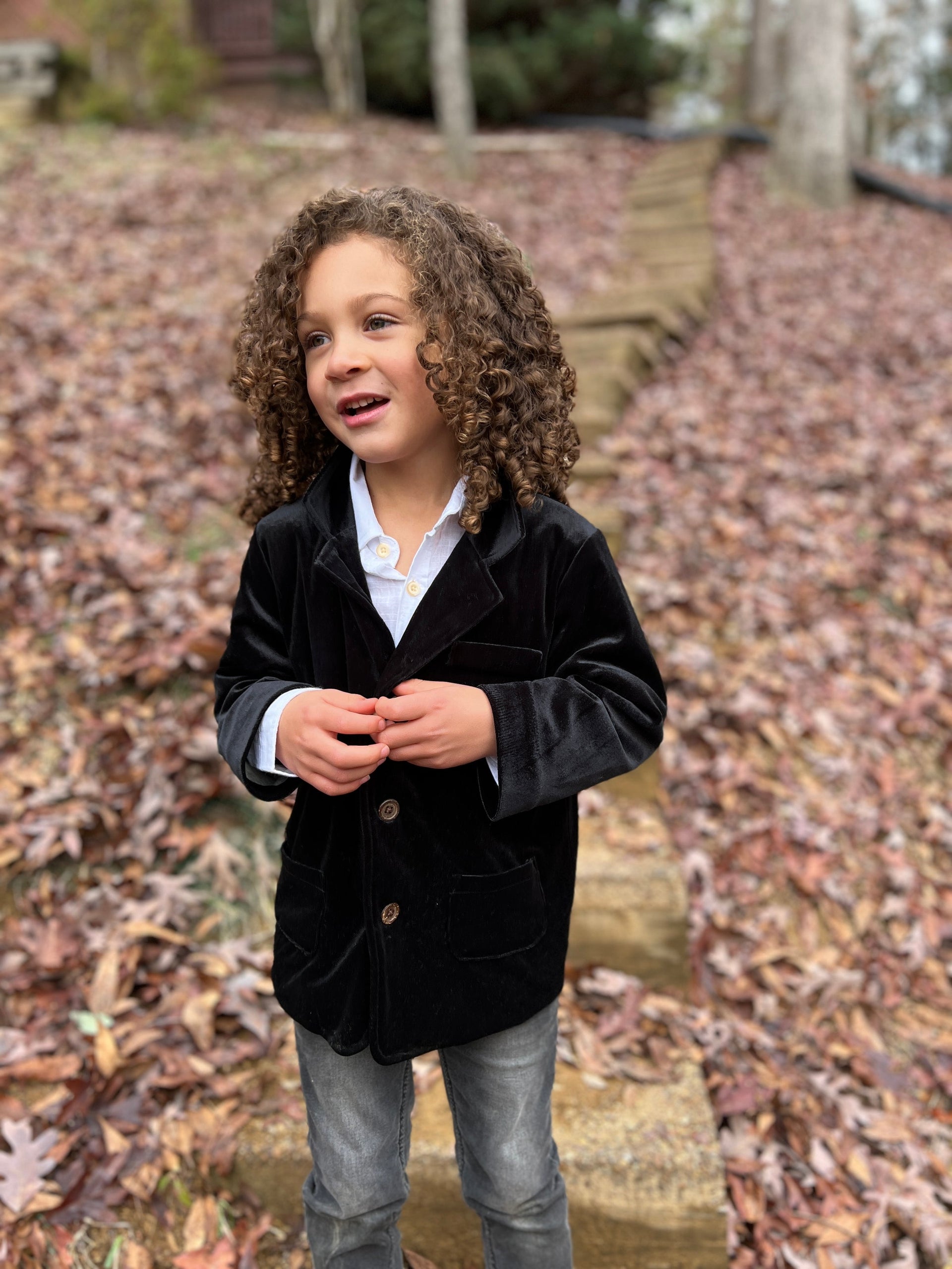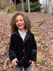 Our Black Velvet RUPERT Jacket is the perfect choice for your little one! How cool is this for Christmas Day or Thanksgiving! Coupled with a white tee or white shirt and jeans! It's made of a soft velvet material that's gentle on their sensitive skin. With its classic style and comfortable fit, it'll make them look and feel great all day long!