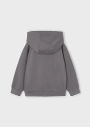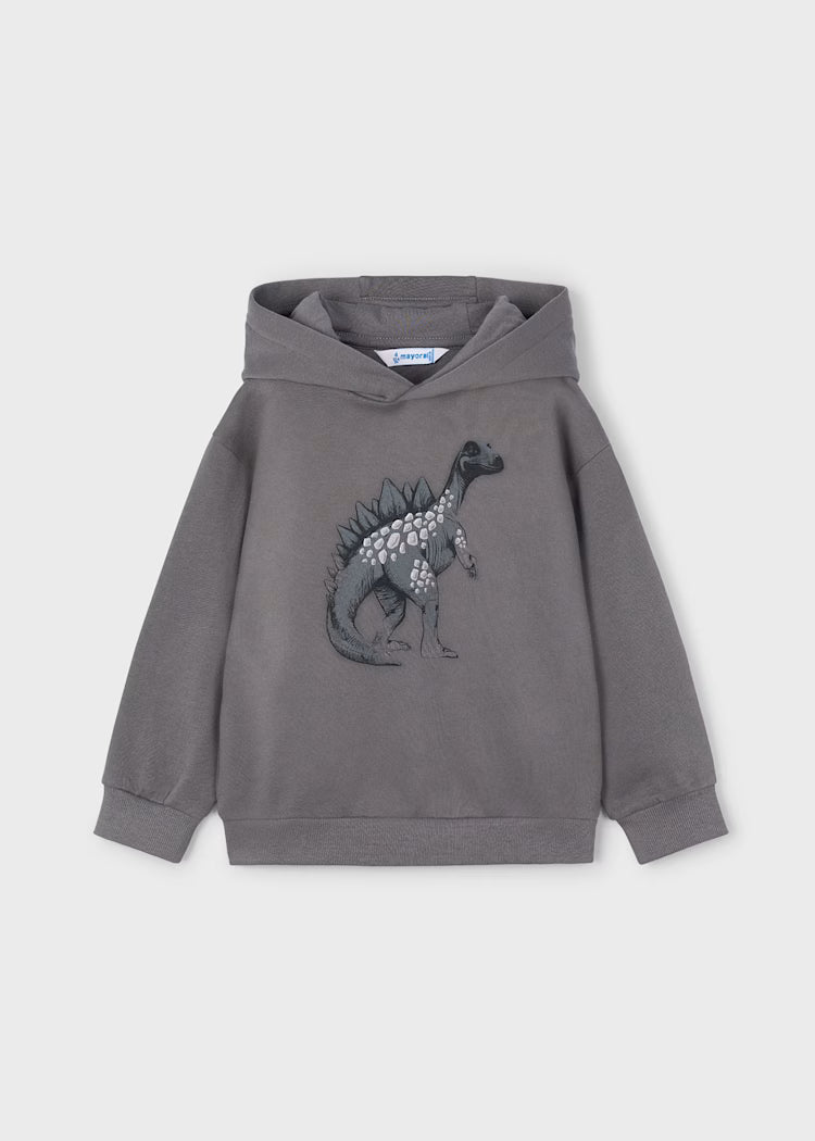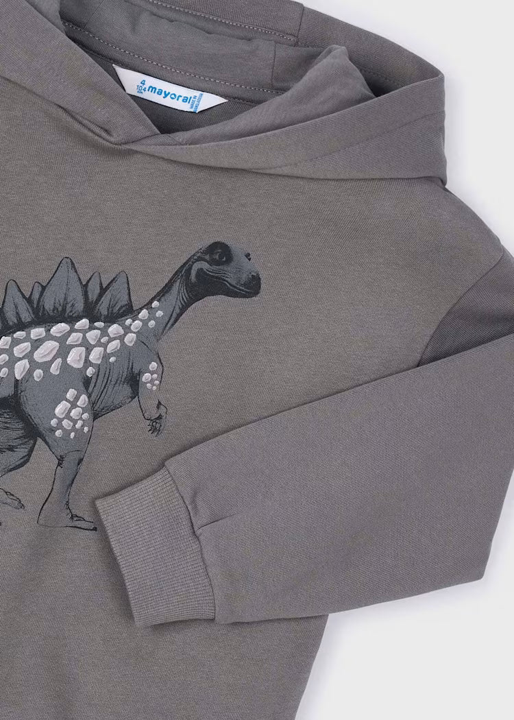 This boy's sweatshirt combines comfort and playful style with a soft 99% cotton and 1% elastane blend. Featuring an embossed dinosaur design and a hooded collar, it offers both warmth and a fun, textured look. The long sleeves and durable fabric make it ideal for everyday wear and active play. The printed details add extra charm, making this grey sweatshirt a practical yet engaging addition to any young boy’s wardrobe.