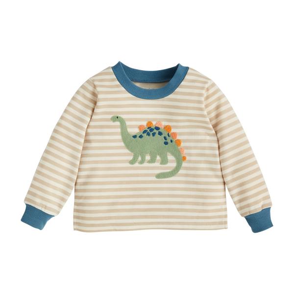 Dinosaur Toddler Sweatshirt. This charming lightweight French terry pullover is perfect for your little one's adventures. It features a delightful dinosaur appliqué that adds a playful touch to their wardrobe. The contrast cotton rib neckline, sleeve openings, and side vent hem provide a comfortable fit and stylish detail. Available in a large size suitable for ages 4T-5T, this sweatshirt is crafted from 100% polyester, ensuring durability and easy care. Ideal for layering or wearing on its own, this sweatshirt combines fun and functionality for everyday wear.