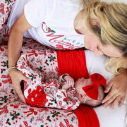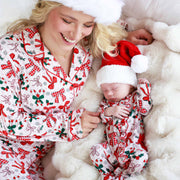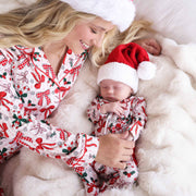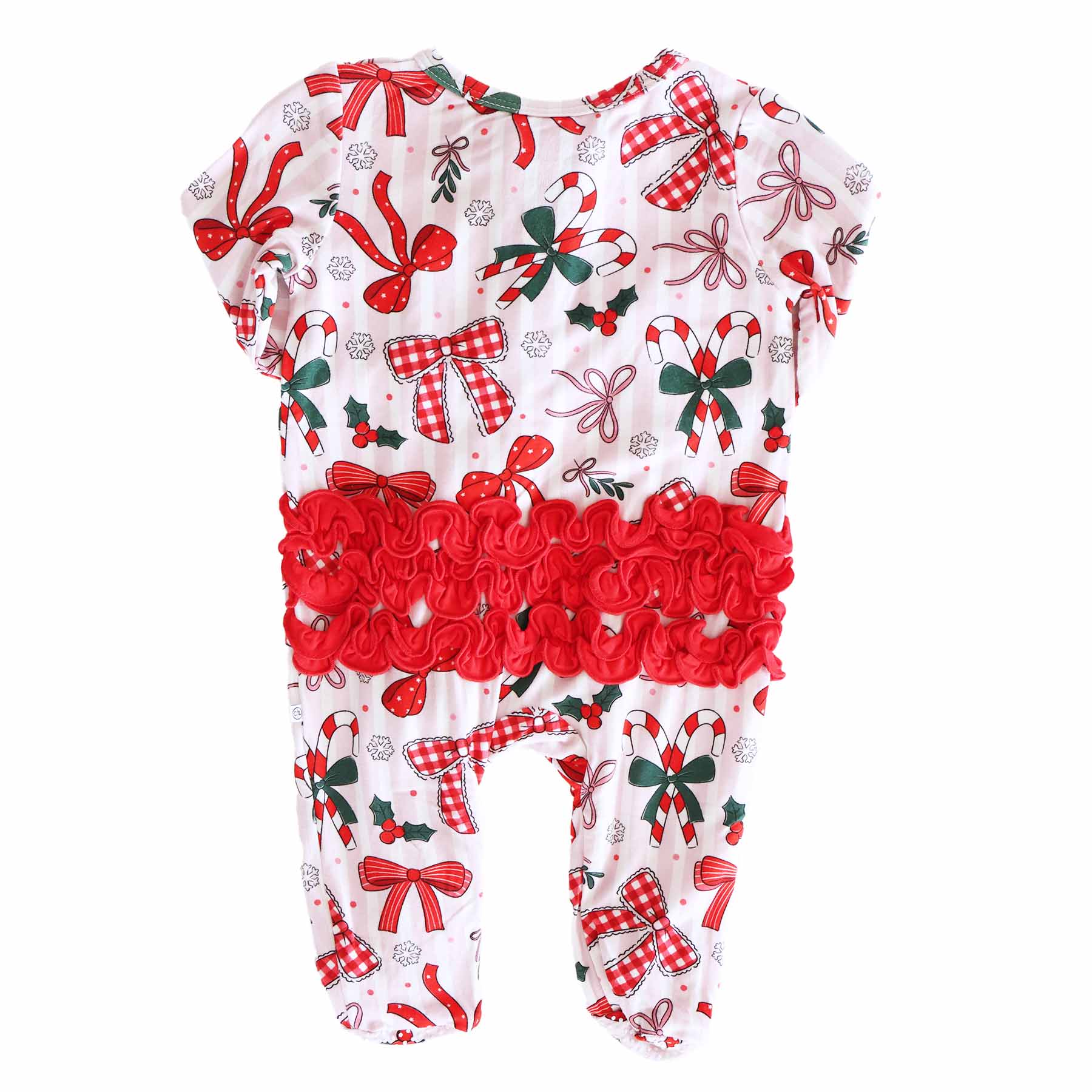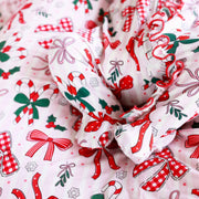 The holidays just got a whole lot sweeter with our Bow What Fun Ruffle Footie! Covered in candy canes, holly sprigs, snowflakes, and the prettiest bows, this festive print looks like it was made for Christmas morning photos. The soft pink stripes add a merry twist, while the delicate ruffles give your little one that extra dose of holiday charm. Made from our buttery bamboo waffle fabric, this footie is lightweight, stretchy, and oh-so-cozy, keeping your baby snug through naps, playtime, and twinkly-light snuggles.