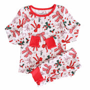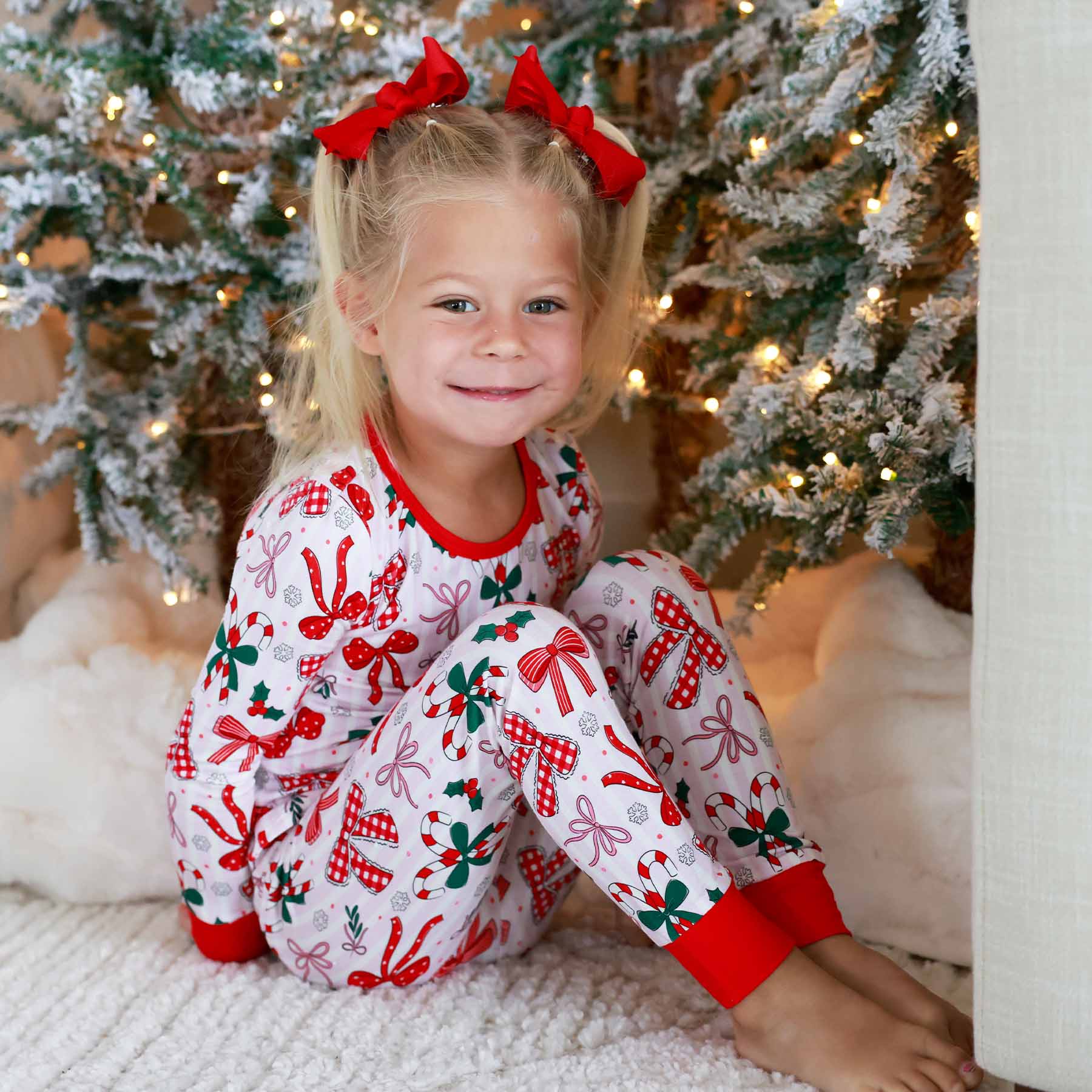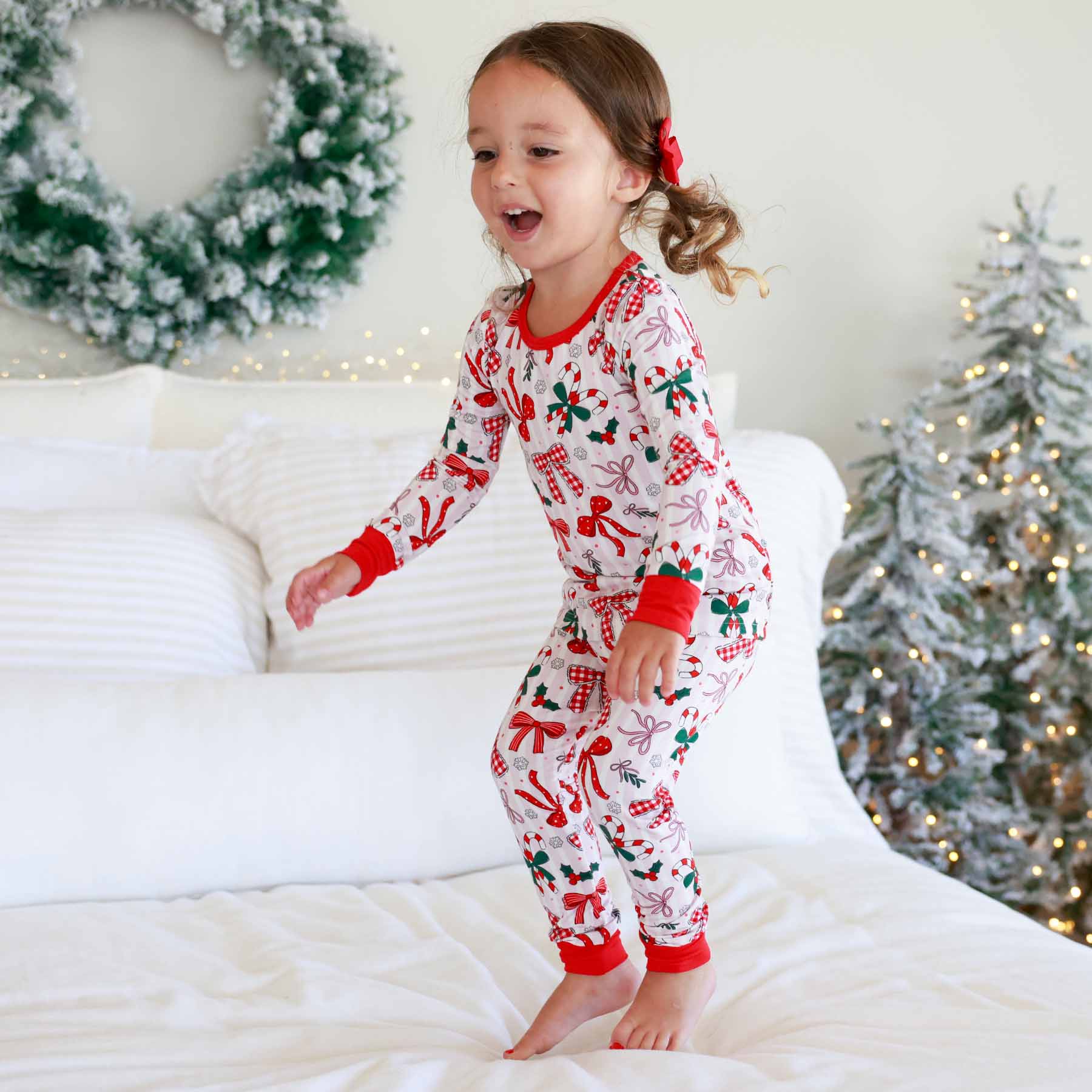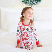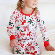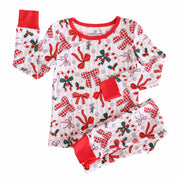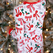 Bring on the Christmas magic with the Bow What Fun Two-Piece Pajama Set! Candy cane stripes, festive bows, and pops of holly turn bedtime into something merry and bright. Made with our signature bamboo fabric, these PJs are cozy, breathable, and soft enough to wear all season long. These pajamas are perfect for dancing to Christmas songs, snuggling up with hot cocoa before bed and matching with the whole family this holiday season.