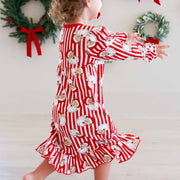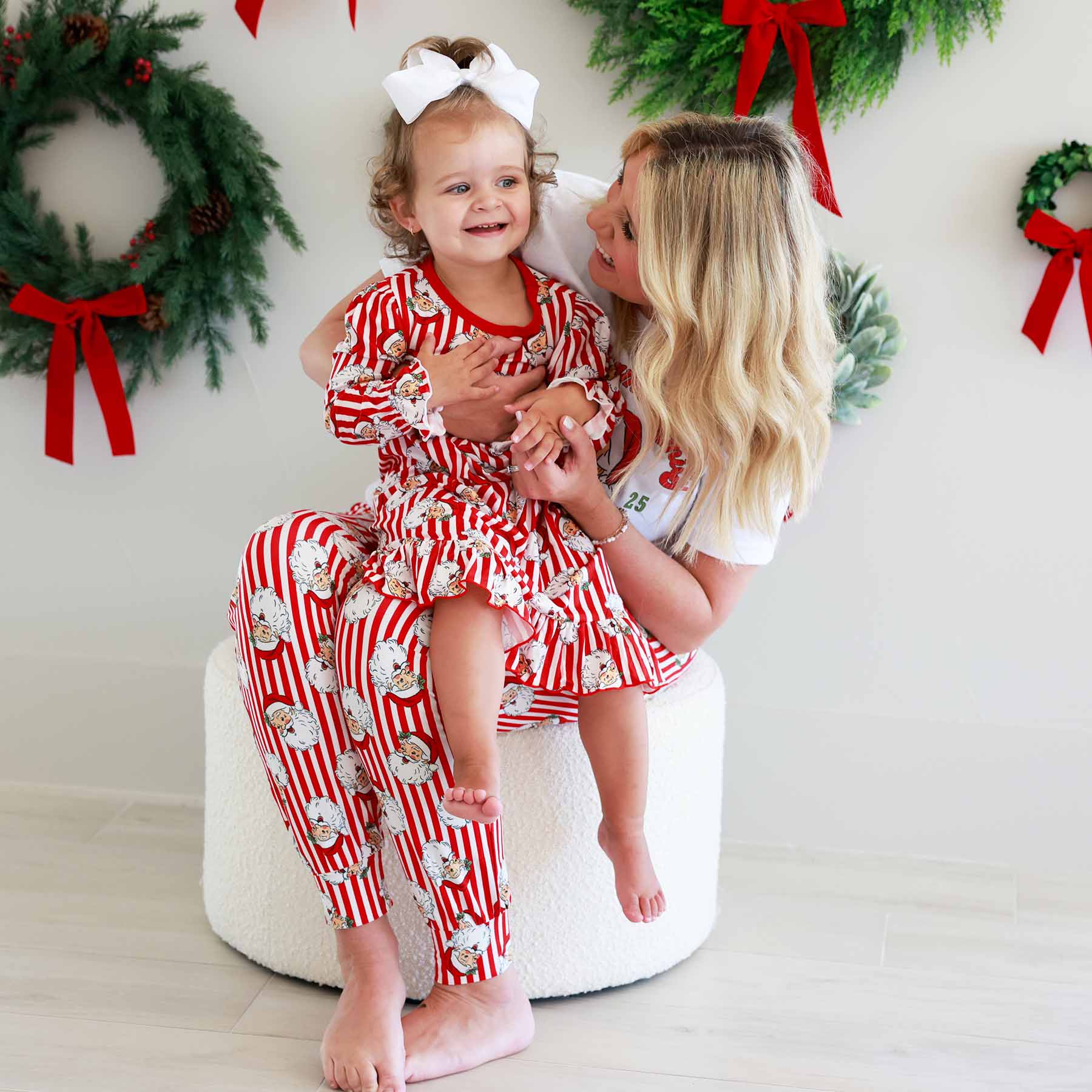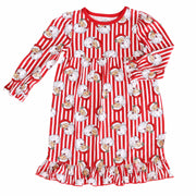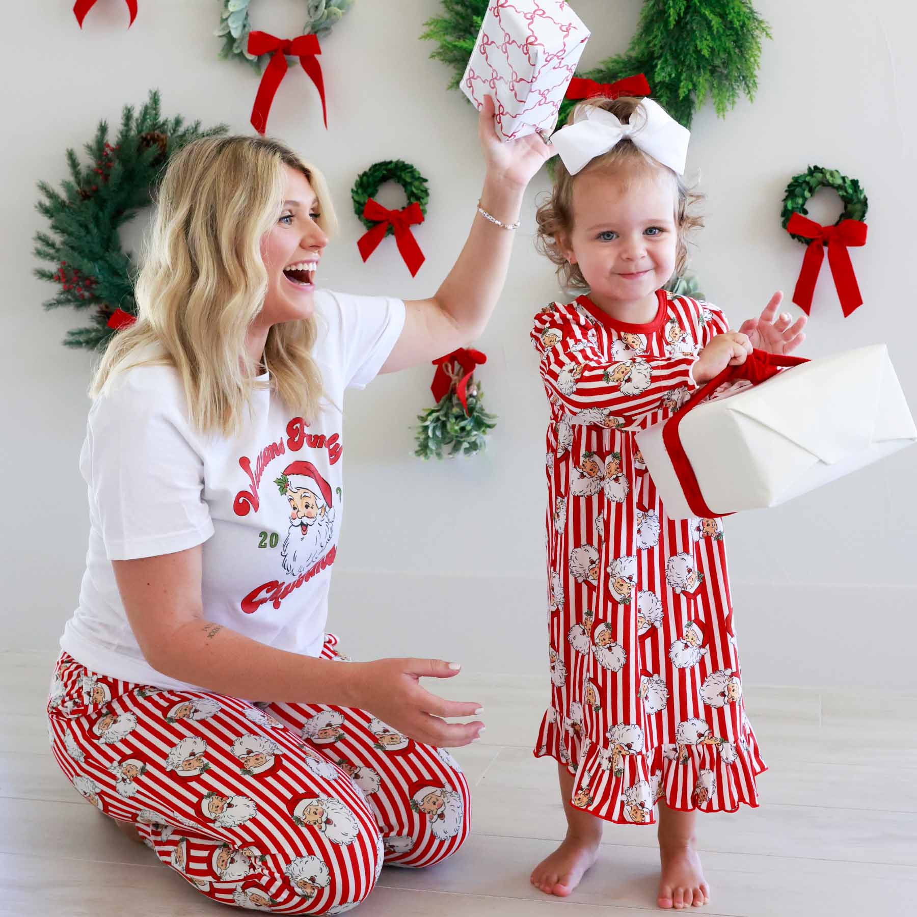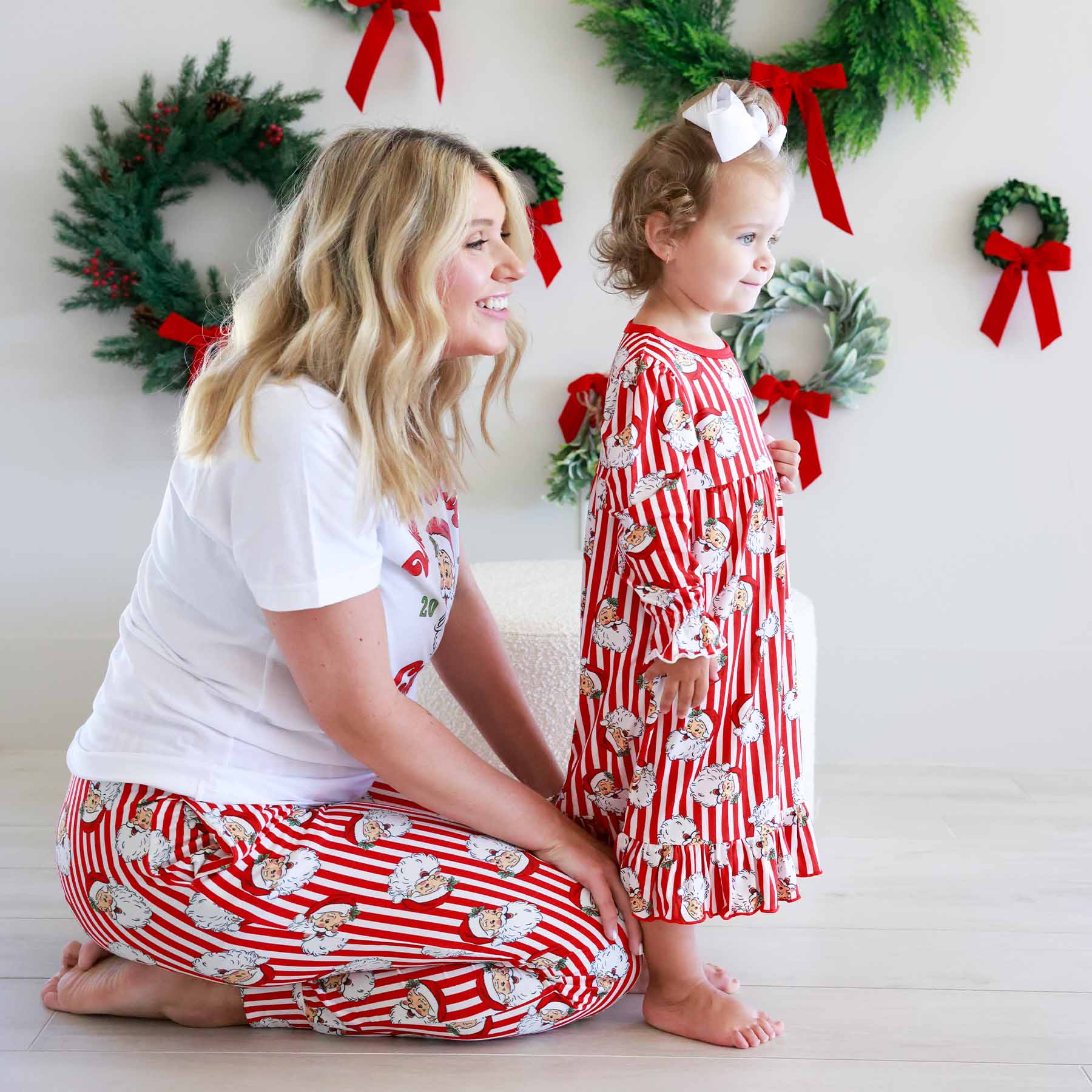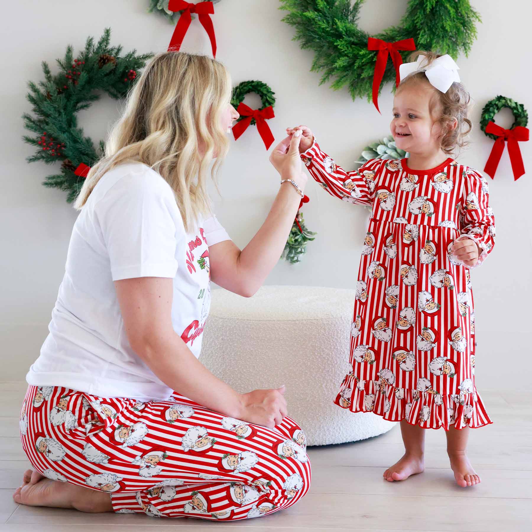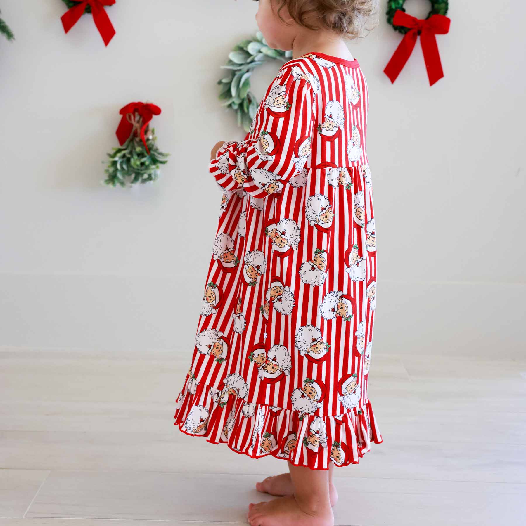Make holiday dreams extra magical with our Santa Claus Lane Girls Nightgown! The jolly Santa print and candy cane stripes give it a nostalgic holiday feel, while the twirl-friendly cut makes it perfect for caroling around the house or dancing by the tree. Crafted from buttery soft fabric, it’s soft, breathable, and lightweight, keeping little ones cozy all night long without ever feeling too warm. Whether it’s for story time, sleepovers under the tree, or the big morning reveal, this nightgown is made for memory-making.
