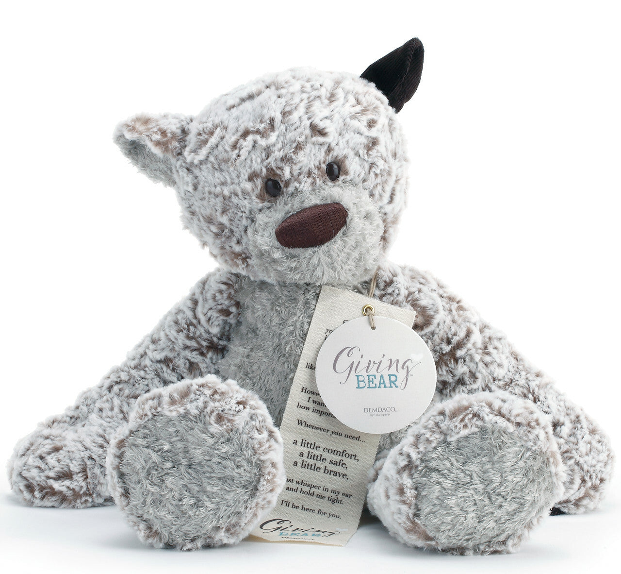 For the young or young at heart, Giving Bear is designed to be gifted to anyone in need of a little comfort, a little brave, a little safe. Everyone needs a hug, and that’s why this cuddly bear is silky soft and lovingly stuffed for endless hugs. Touchable, textured fabrics offer a soothing feel to this floppy companion. Weighted paws and extra-long arms make this plush teddy bear extra inviting, and his special corduroy ear is perfect for listening. A keepsake bookmark with a message of encouragement comes tied around Giving Bear’s neck to offer bravery and strength when it is needed most. A DEMDACO Giving Bear is a friendly companion to remind the recipient that a friend is always near. A portion of the proceeds from the sales of this 16” Giving Bear will be donated to Children’s Mercy Hospital, Kansas City. Share a hug with someone you love.