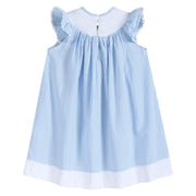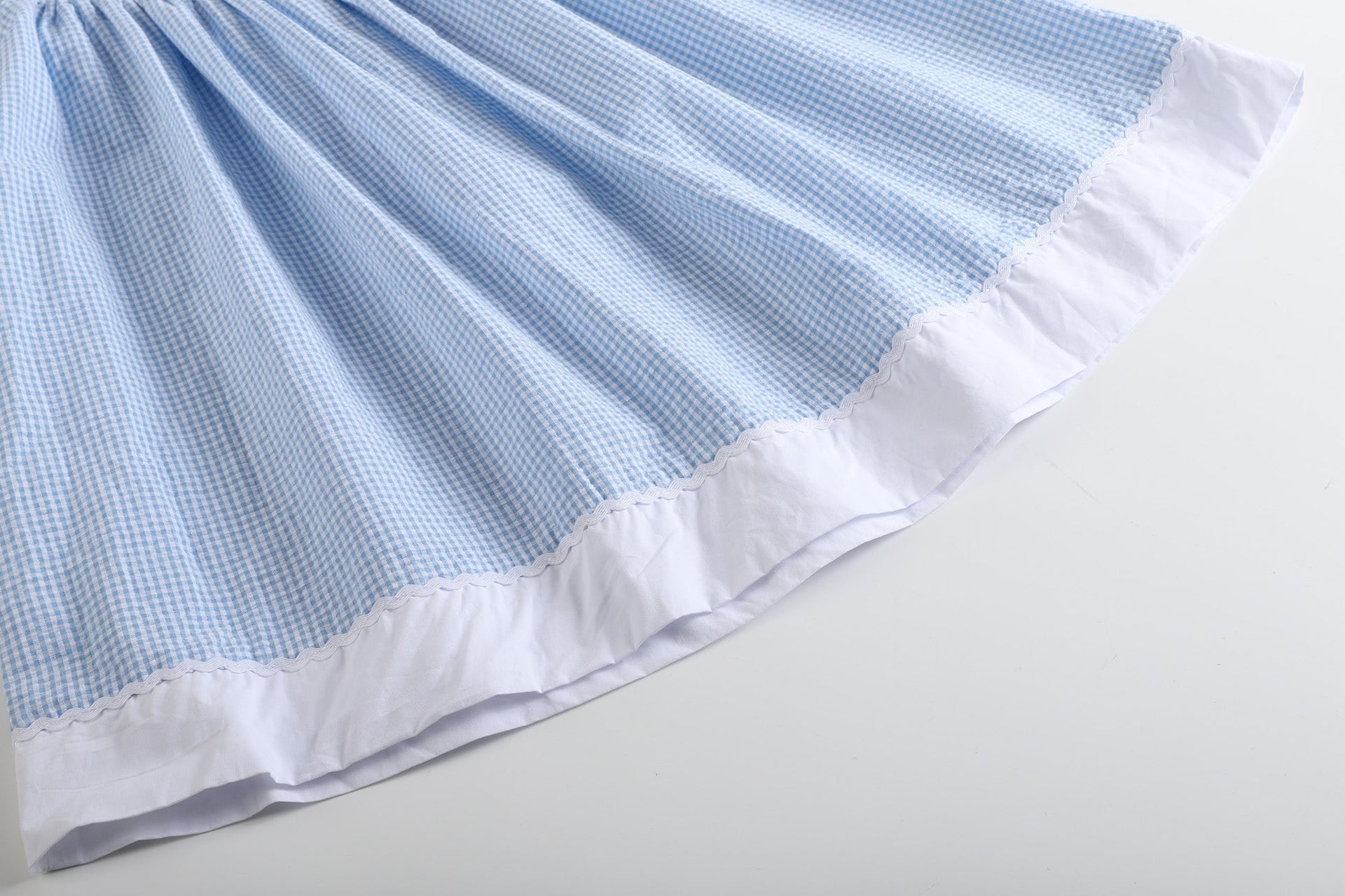 This precious Blue Gingham Easter Bunny Smocked Bishop dress is sure to make your little one "hop" for joy! Featuring a light blue gingham pattern, smocking at the neckline, and a delightful bunny embroidery with pom pom tails-- this dress will keep your girl looking "egg"-cellent all season long!