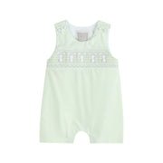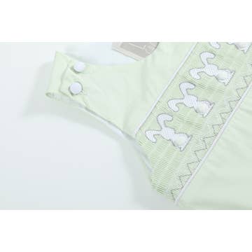 Dress your little one in style with our Honeydew Green Bunny Smocked Shortall. Featuring delicate smocking and embroidered bunnies with pompom tails, these adorable overalls are perfect for any occasion. With buttons at the shoulder for sizing and snaps at the crotch for easy diaper changes, your little bunny will be ready to hop into spring!