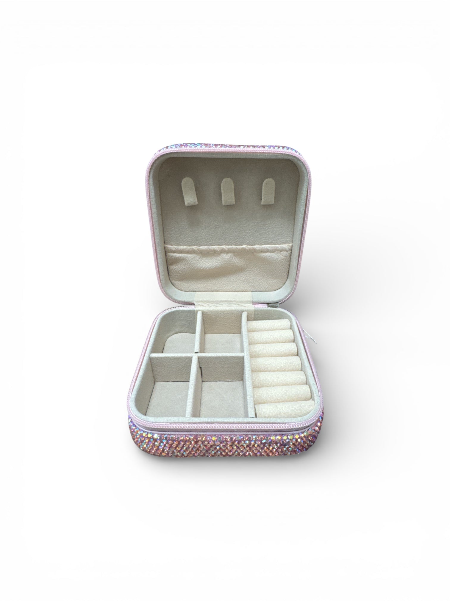 Keep your treasures safe and stylish with this Small Travel Crystallized Jewelry Box. Perfect for on-the-go adventures, this compact box sparkles with crystallized details that catch the light beautifully. Store your favorite rings, earrings, necklaces, and bracelets in one gorgeous spot—whether you're packing for a weekend getaway or organizing your everyday essentials. The durable design protects your precious pieces while the shimmering finish adds a touch of glamour to any vanity or travel bag. Your jewelry deserves a home as fabulous as it is.