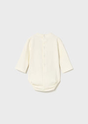 This long-sleeved newborn bodysuit features a comfortable mock neck and secure snap-button fastening at the back. Designed with snap buttons at the crotch, it allows for easy diaper changes and dressing. Subtle embroidery adds a refined decorative touch, making it both practical and stylish for your baby’s everyday wear.