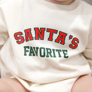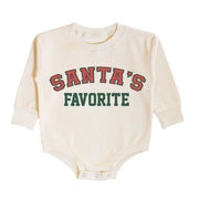The Santa's Favorite Christmas Long Sleeve Romper offers a soft, comfortable fit crafted from 100% cotton with a ribbed blend for stretch and durability. Designed for infants, it features a tagless neck label to prevent irritation, cuffed sleeves, and a convenient three-snap closure for easy dressing. Its natural base color is accented with festive red and green graphics, making it perfect for holiday celebrations. This romper combines practicality with seasonal style and is machine washable for effortless care.