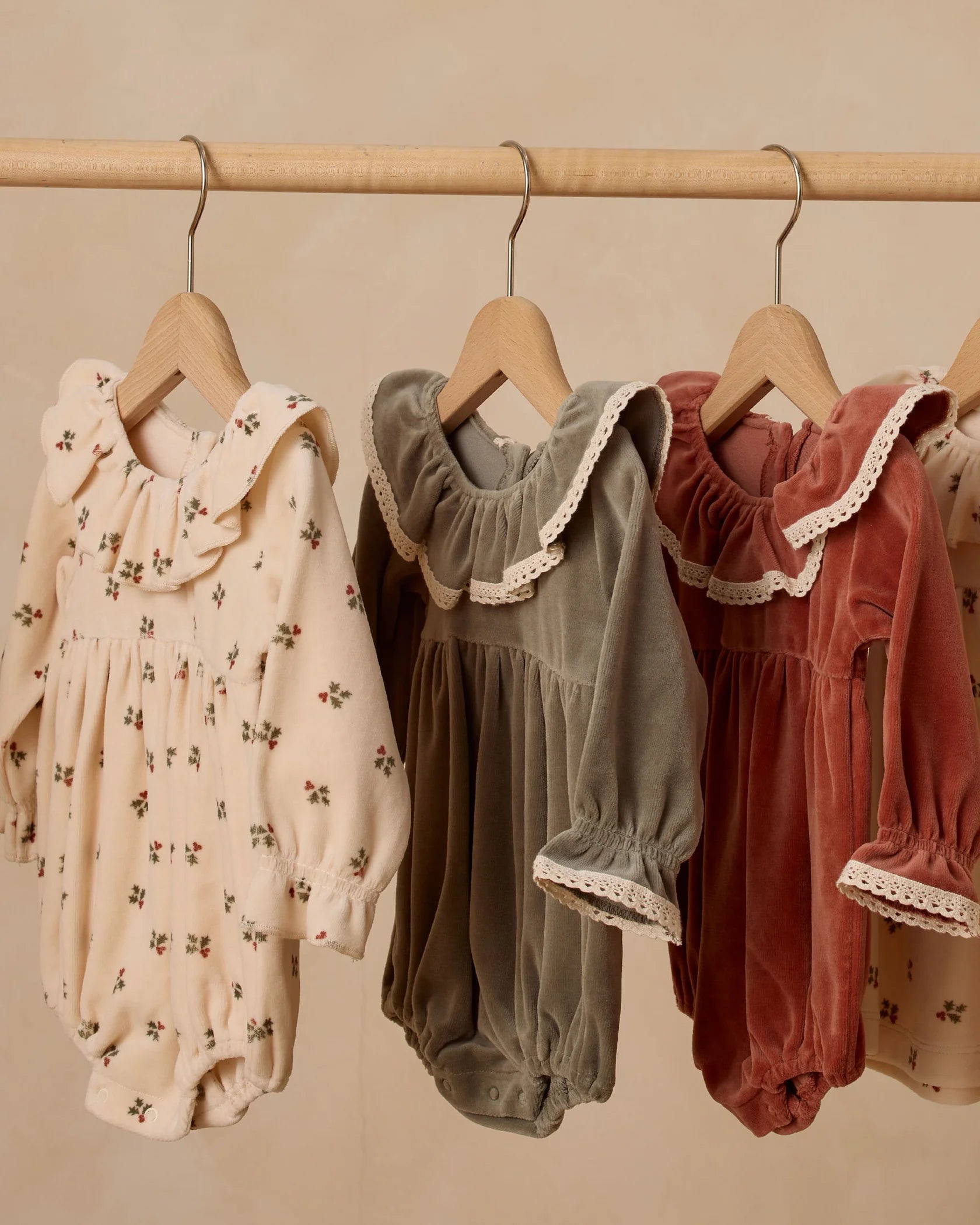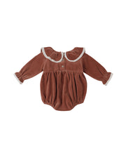 Longsleeve velour romper with gathered waist, ruffle collar, and lace trim details at neckline and cuffs. Snap closures along the inseam for easy changing.