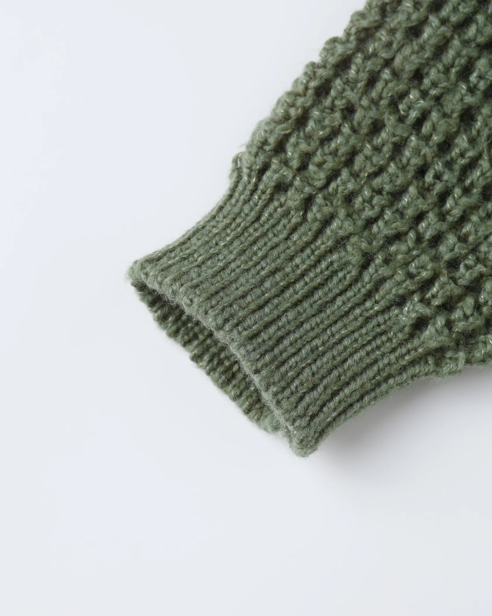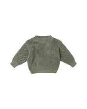 Adorable unisex chunky knit sweater with ribbing at the sleeve and neck openings.