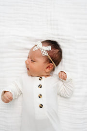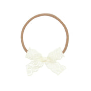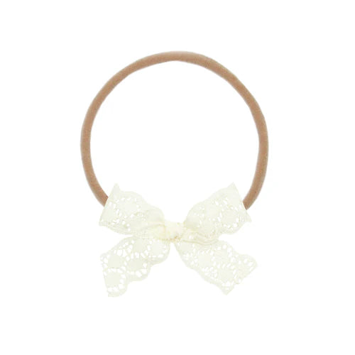 Truly one of a kind! Each bow is hand-tied by local moms with one of a kind vintage lace and attached to a one-size-fits-all nylon headband. All bows and edges are secured and sealed so they don’t come undone.