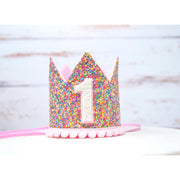 Candy Sprinkle Glitter Crown with a pink pom trim. White glitter number backed in pink felt.
