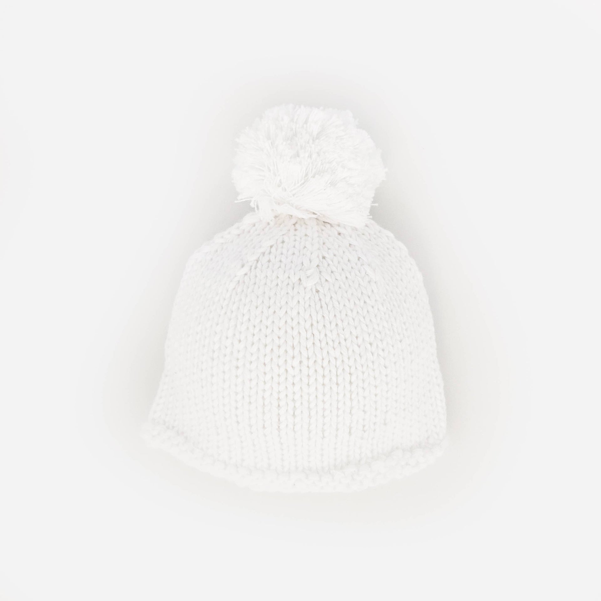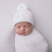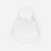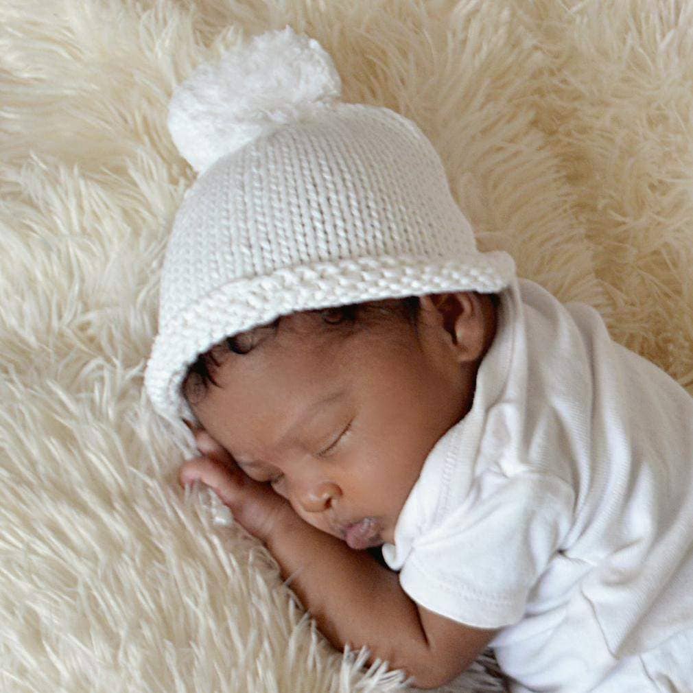 This newborn white pom pom beanie hat is expertly crafted from 100% cotton, providing gentle warmth and comfort for infants weighing 6 to 9 pounds. Its hand-knit design ensures softness and a delicate touch against sensitive skin. The roll-up brim allows a subtle size adjustment, making it ideal for first portraits or as a thoughtful baby shower or hospital gift. Recommended for cold hand washing to maintain its quality and shape.