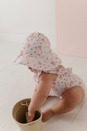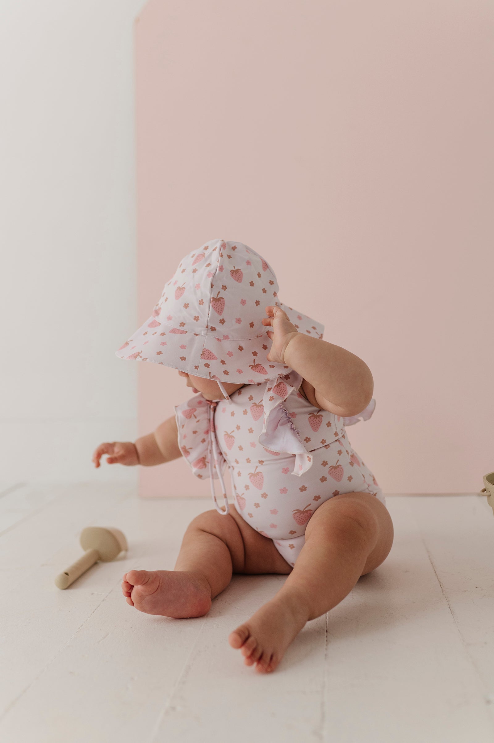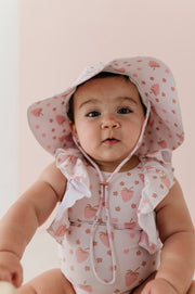 Keep your little one shaded in style with this adorable Strawberries Sun Hat from Babysprouts Clothing Company. Crafted from soft recycled polyester, it's gentle on delicate skin while providing reliable sun protection. The cheerful strawberry design is exclusive to Babysprouts, making it a fun addition to any baby's wardrobe. Perfect for outdoor adventures, beach days, or backyard playtime!