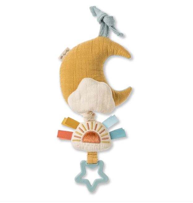 A Lullaby to Go! Create calming vibes wherever you go with our Bitzy Notes™ musical pull toy. Made of soft natural cotton fabric, this plush baby toy easily attaches to your car seat or stroller and plays a soothing melody with a simple pull. It also includes a grasping ring and ribbons to encourage further interaction from your little one. Cue the music, it’s time to chill!