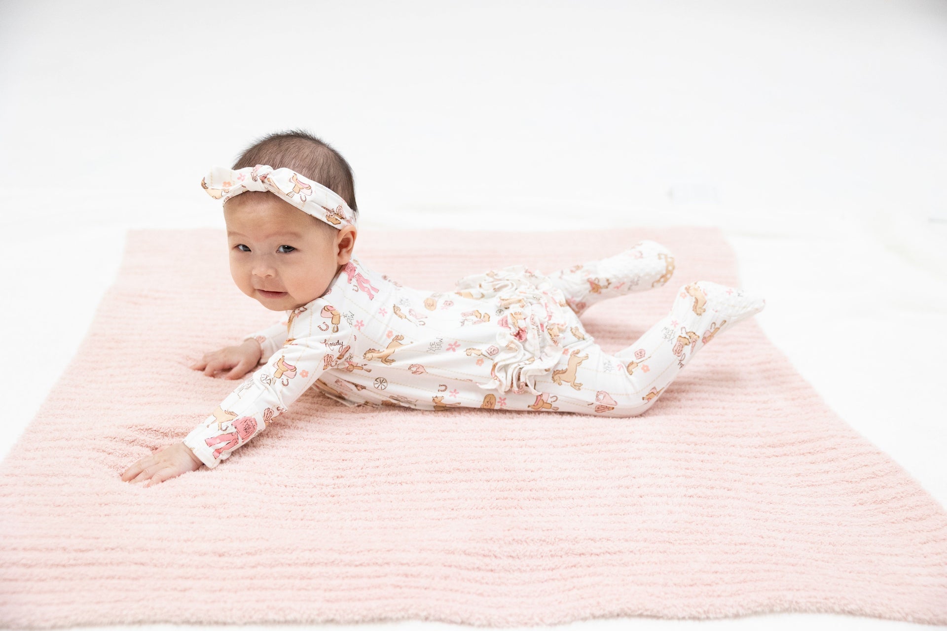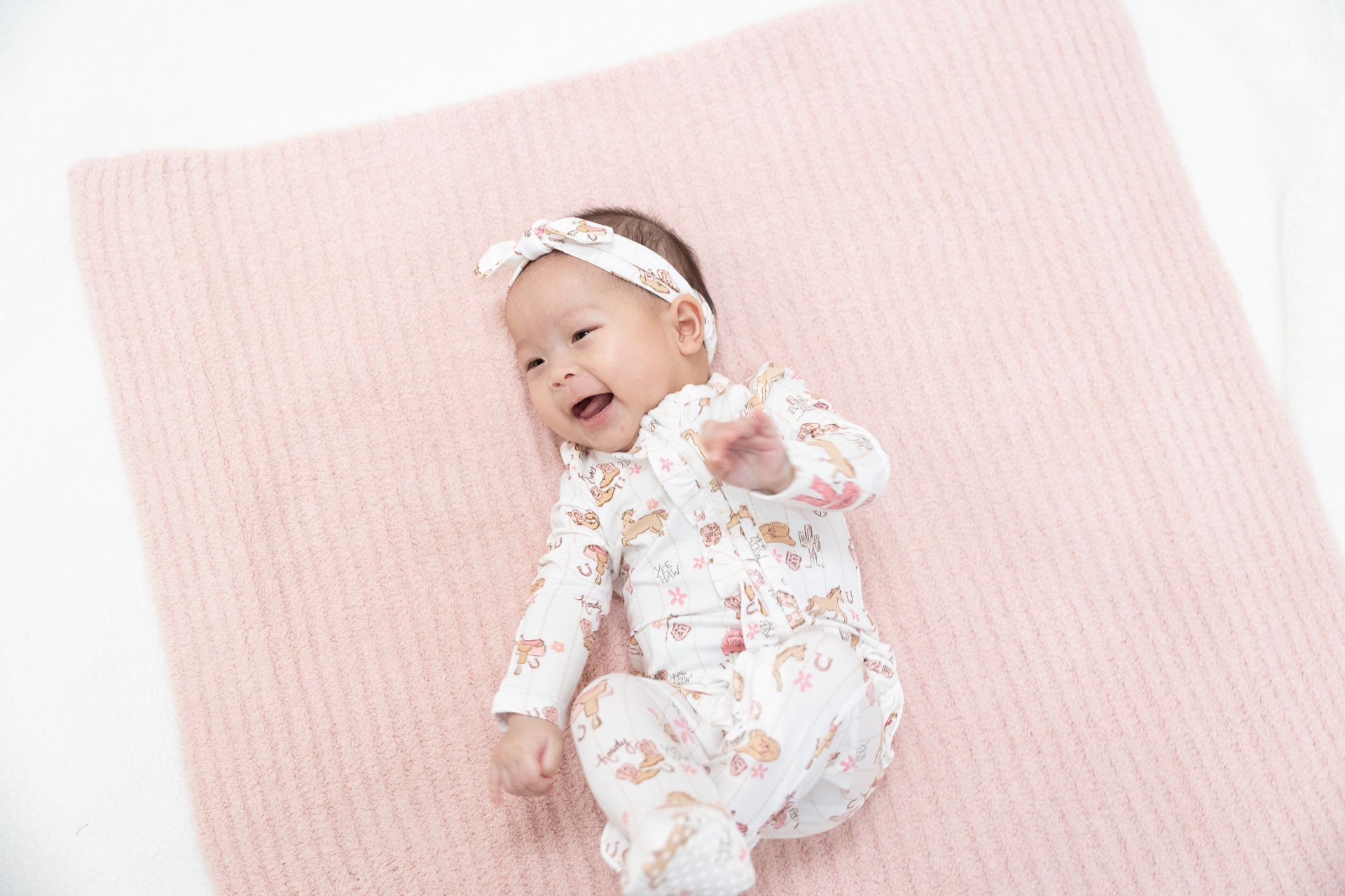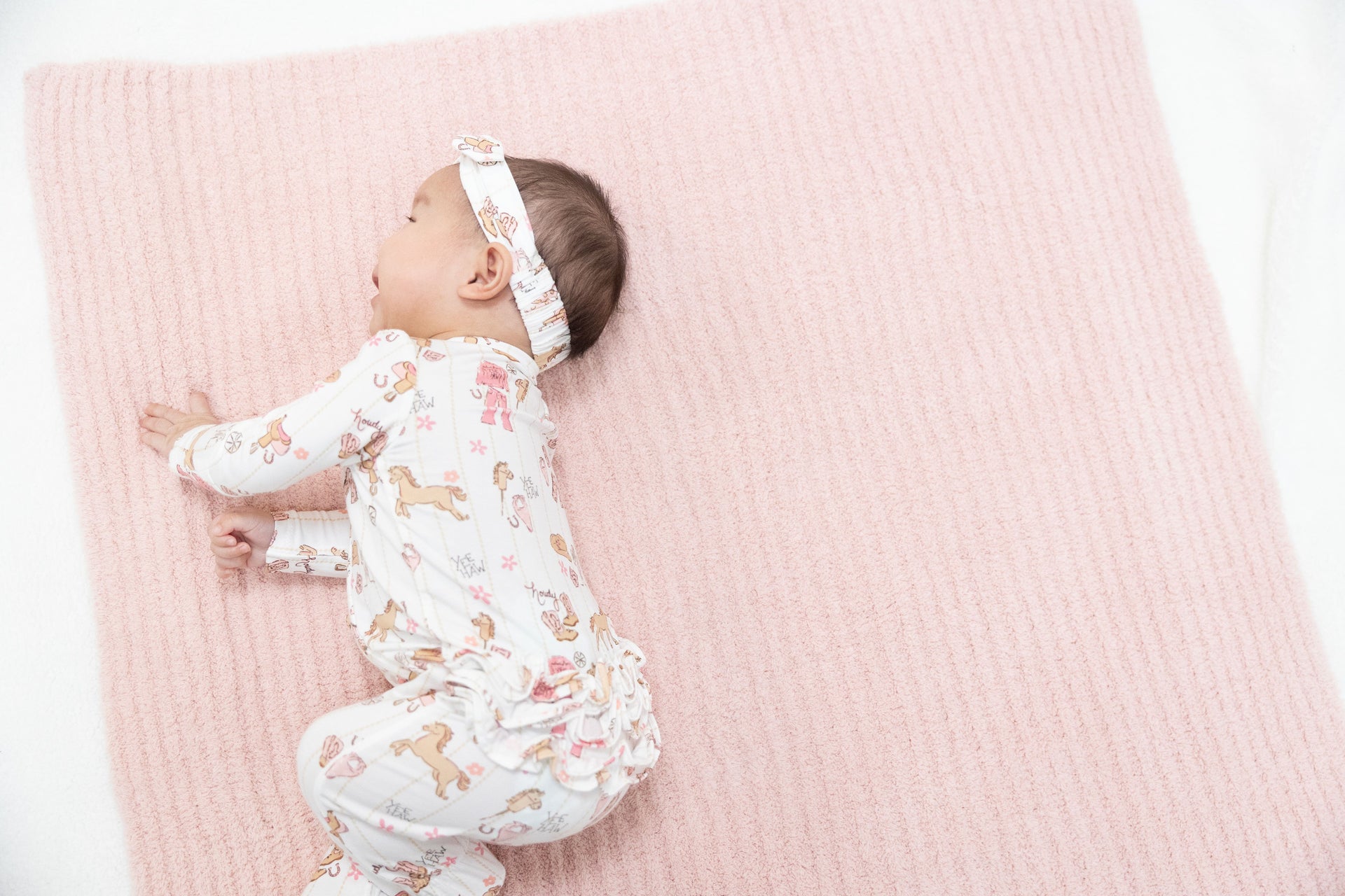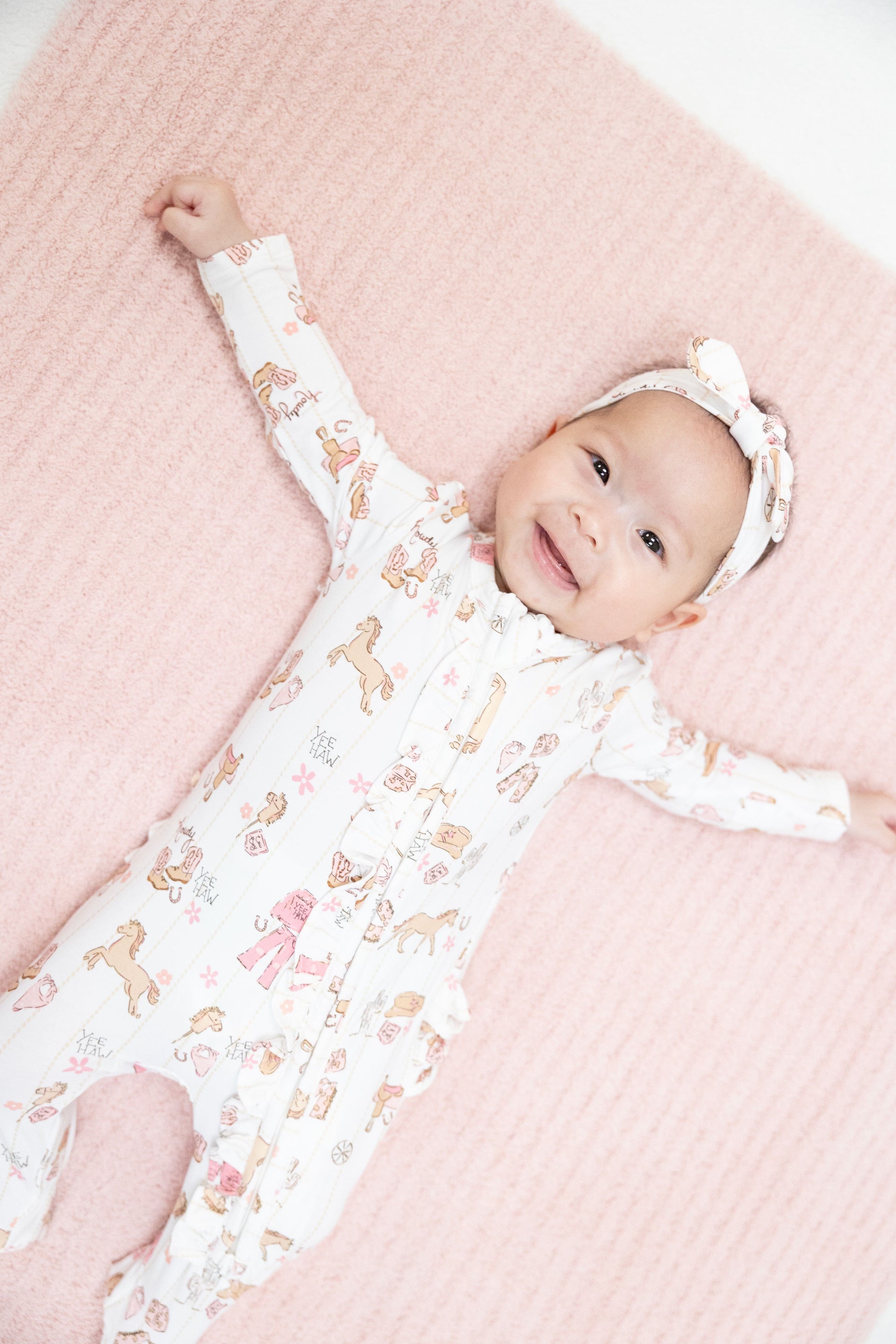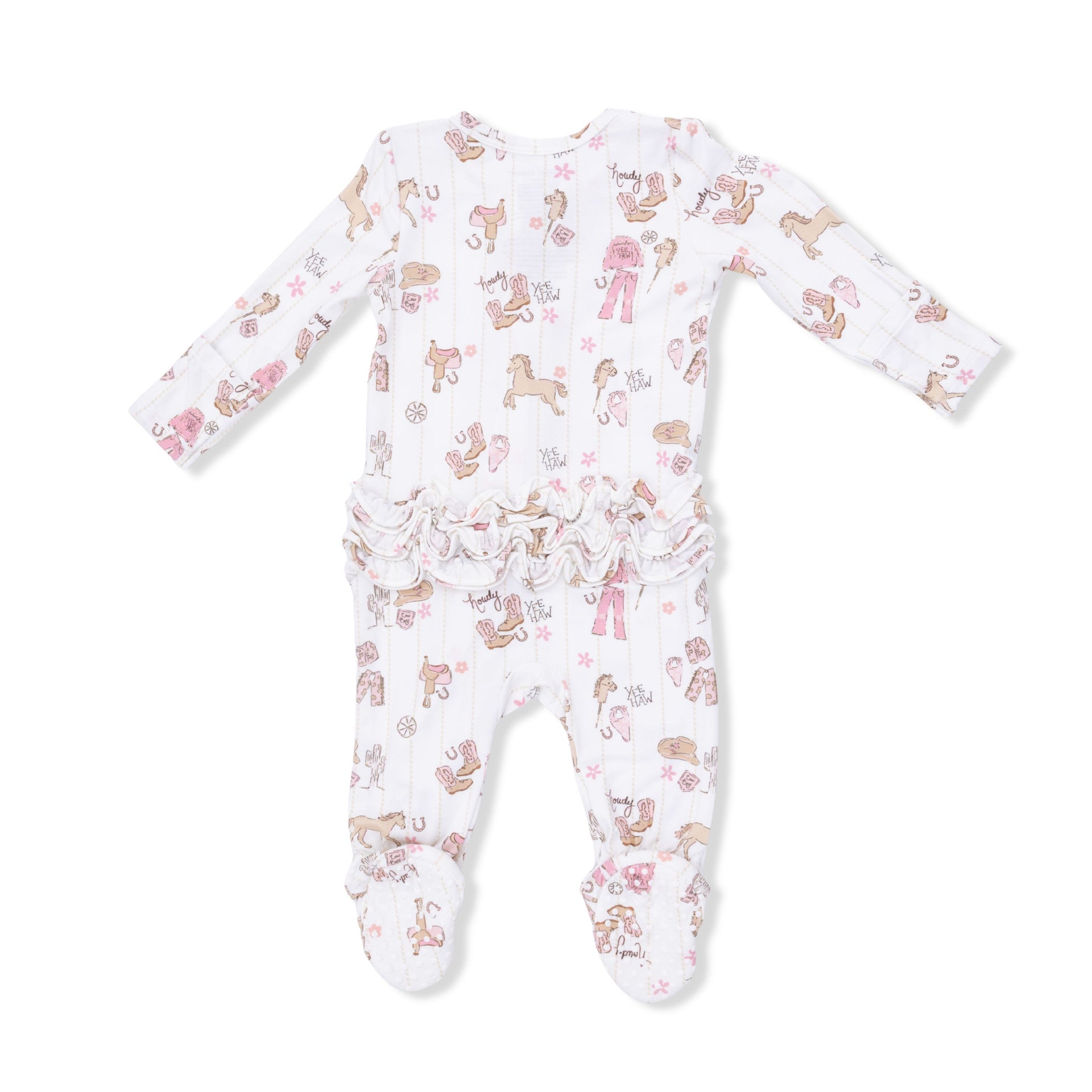 Saddle up for bedtime in this adorable cowgirl-themed footie! Featuring charming western details and ruffled accents, this cozy one-piece keeps your little buckaroo warm and snug all night long. The convenient zipper makes diaper changes a breeze, while soft fabric ensures comfort from dusk till dawn. Perfect for the tiny cowpoke who loves all things ranch and rodeo. Sweet dreams, partner!
