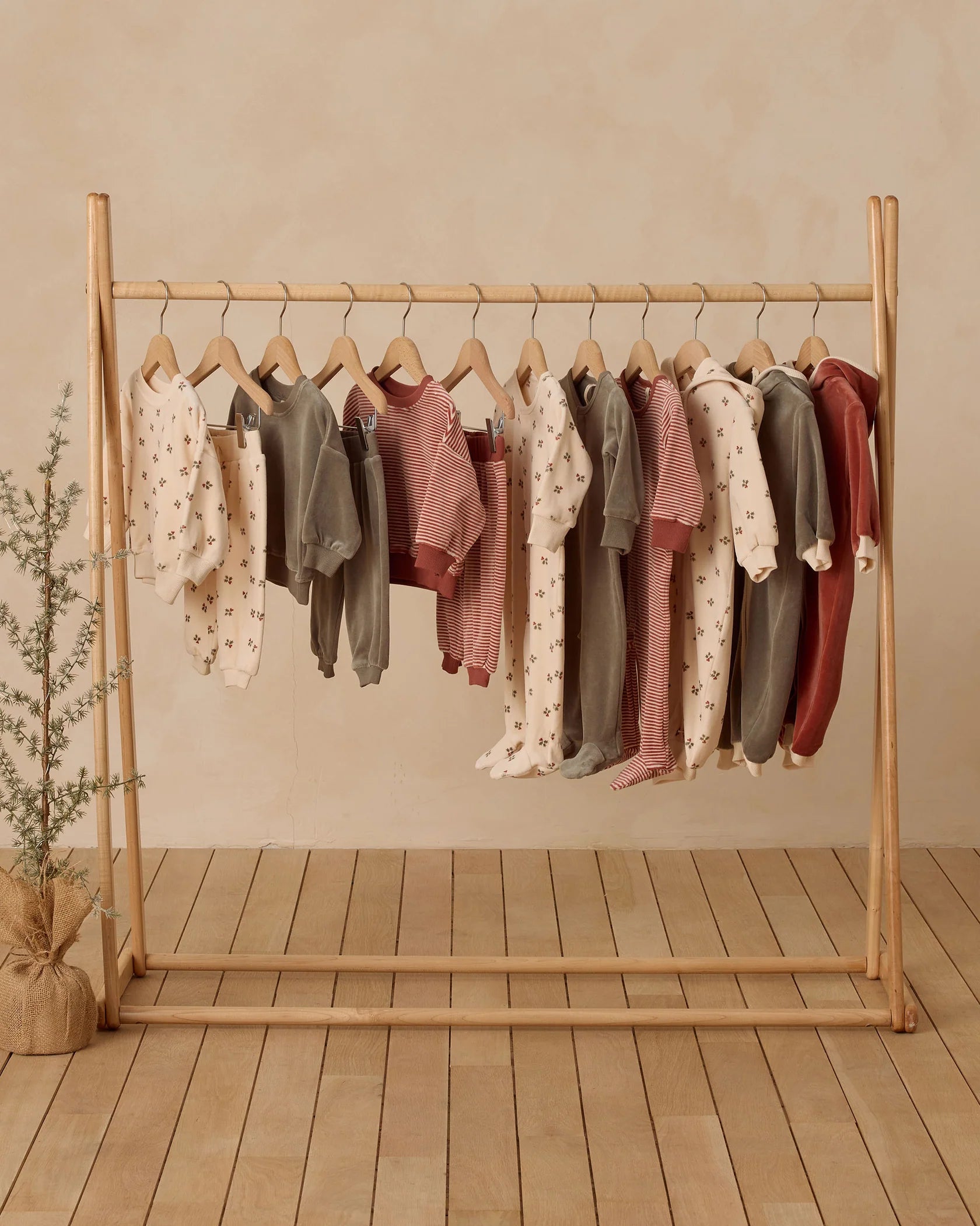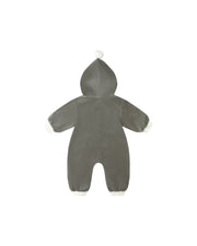 Longsleeve hooded fleece jumpsuit with ribbed sleeve and leg openings, a zipper down the front, and a hoodie with a pom pom on top.