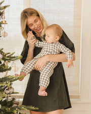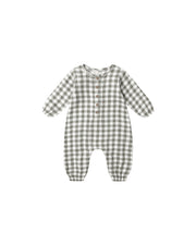 Long sleeve jumpsuit crafted from soft organic cotton gauze, featuring coconut buttons down the chest, hidden snaps along the inseam for easy changing, and elastic at the sleeve and leg openings for a perfect fit.