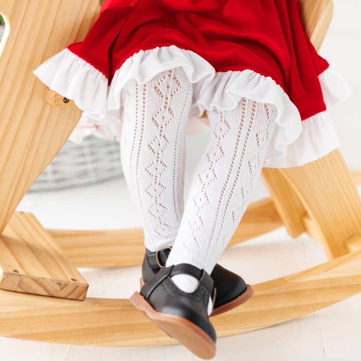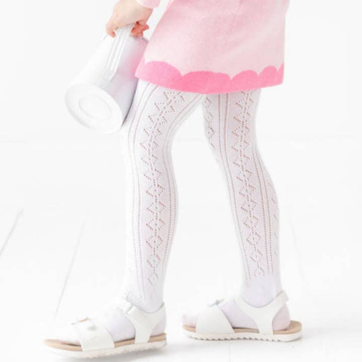 Looking for something a little ✨fancier✨ than our standard cable knit? Give our all new Fancy Tights a try! The gorgeous open knit design adds the perfect vintage touch and will be a staple in her wardrobe! Open knit design ends at upper thigh. Machine wash cold with like colors. Tumble dry low or lay flat to dry.