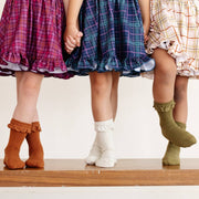 Roadtrip Lace Midi Sock 3-Pack Contains 3 pairs of adorable lace trimmed midi socks in the following colors: Heathered Ivory, Olive & Sugar Almond Midi socks are made to hit in between the ankle and lower calf. Variations in sock length are normal.