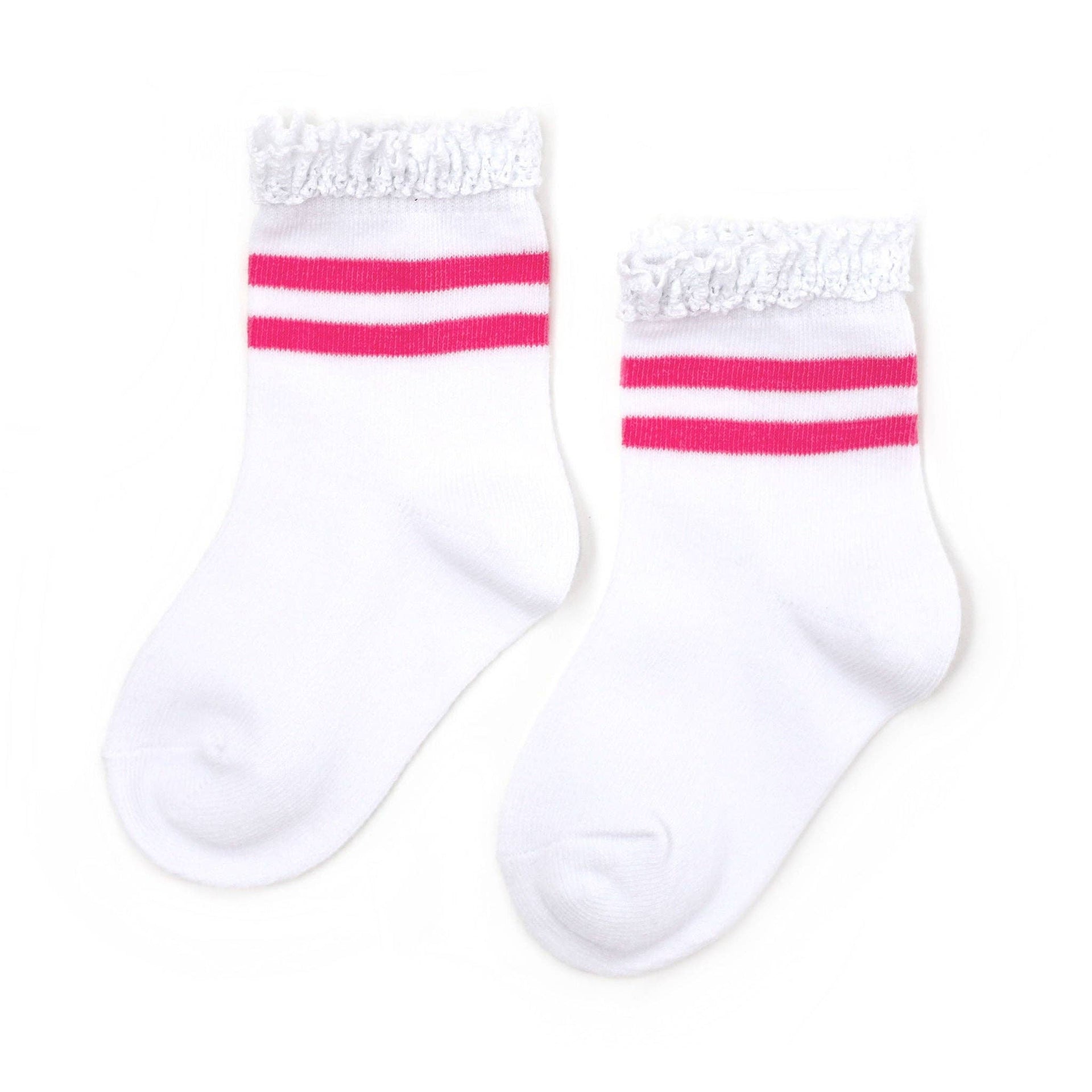 They're baaaaaaaack! The fan favorite white and hot pink striped lace trimmed midi socks. The perfect year round sock for your girly!