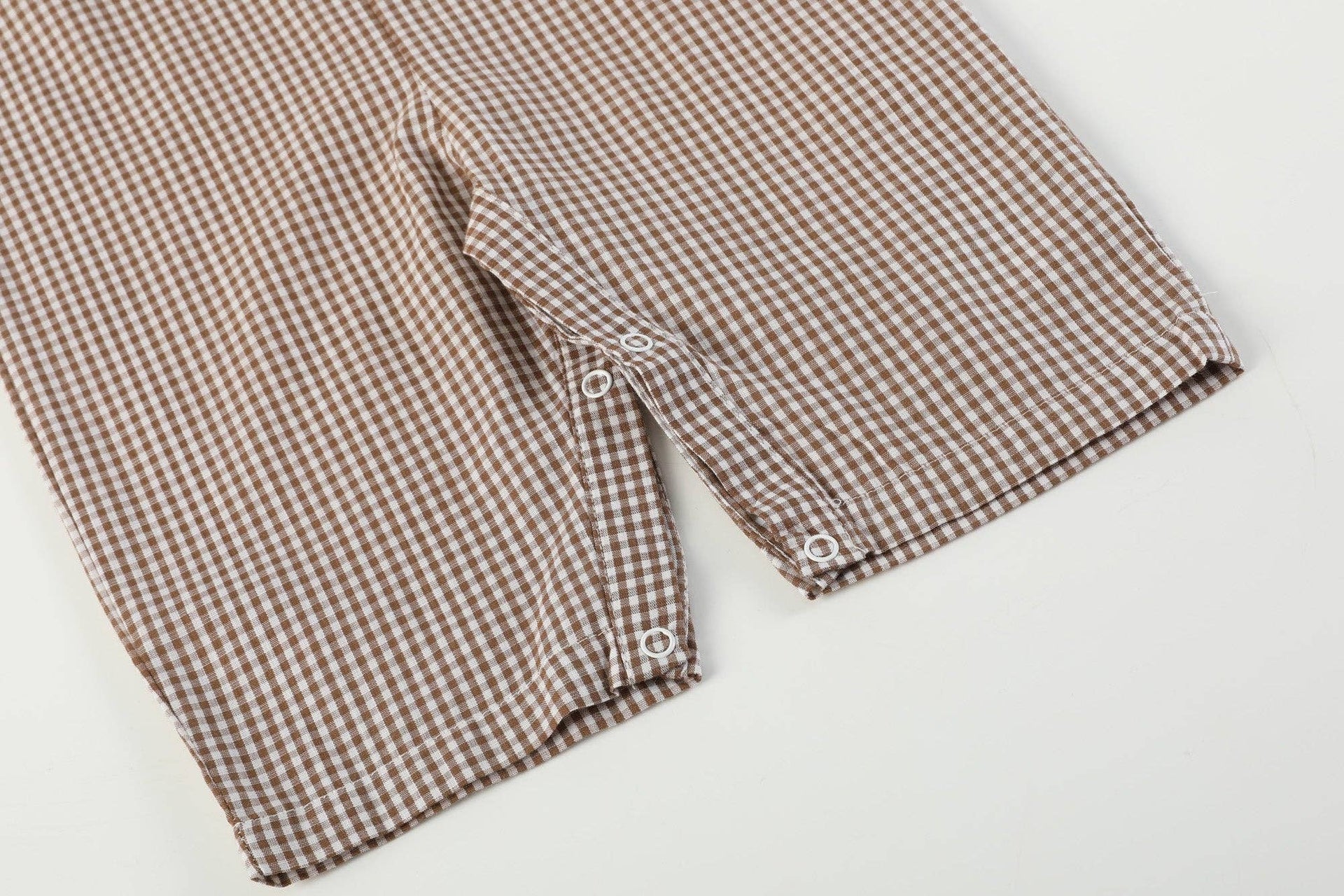 Harvest some smiles with our Brown Gingham Pumpkin and Corn Tractor Smocked Overalls! These overalls are the 'wheely' cute choice for your little farmer, featuring smocking at the chest and embroidered tractors and pumpkins. Perfect for fall frolics and adorable tractor tales, they're the pick of the patch for your autumn adventures!