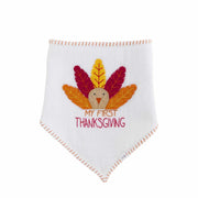 This White Thanksgiving Turkey Bib is an excellent way to let your child enjoy the holiday meal in style. The bib is made from a muslin bandana style and soft long pile minky backing for comfort and practical protection. The turkey applique on the front adds a charming festive touch.