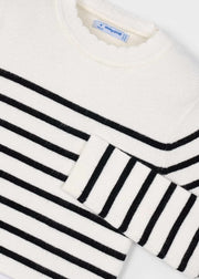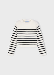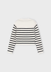 The Girl Striped Knit Sweater offers a soft, comfortable fit crafted from knitted fabric that feels gentle against the skin. Designed with a distinctive waved collar and a classic striped pattern, this long-sleeved top combines playful details with everyday wear-ability, making it a stylish and cozy choice for tween girls.