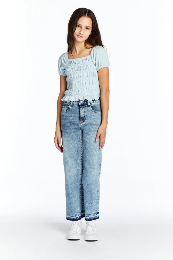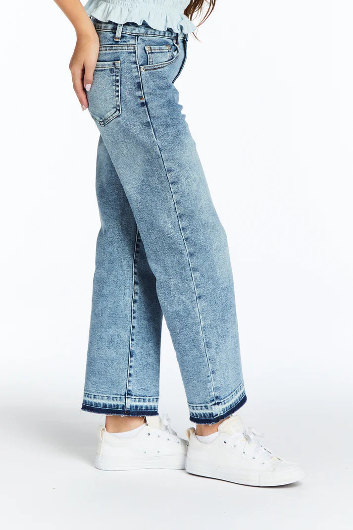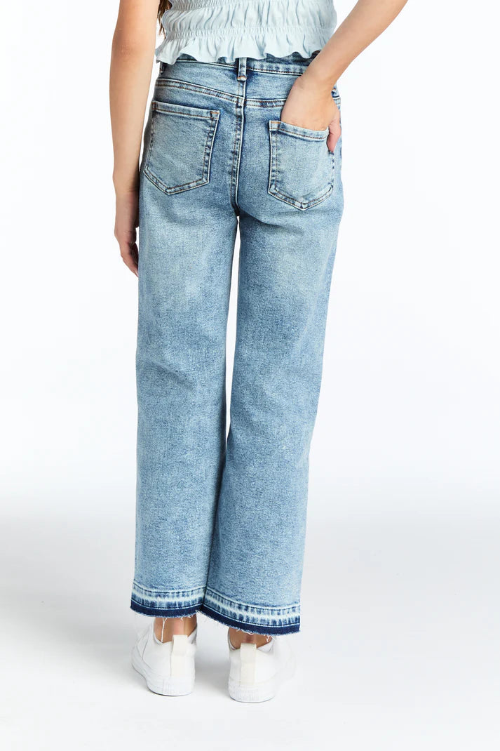 These High Rise Wide Leg Straight Crop jeans feature a flattering high-rise fit and a modern wide-leg silhouette crafted from stretchable denim for lasting comfort. The released hem detail adds a contemporary finish, making them a stylish and versatile addition to your tween’s wardrobe suitable for both casual and dressier ensembles.