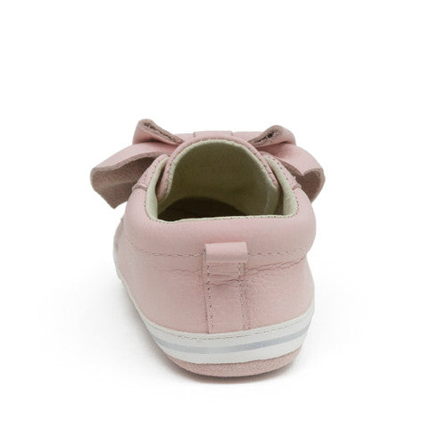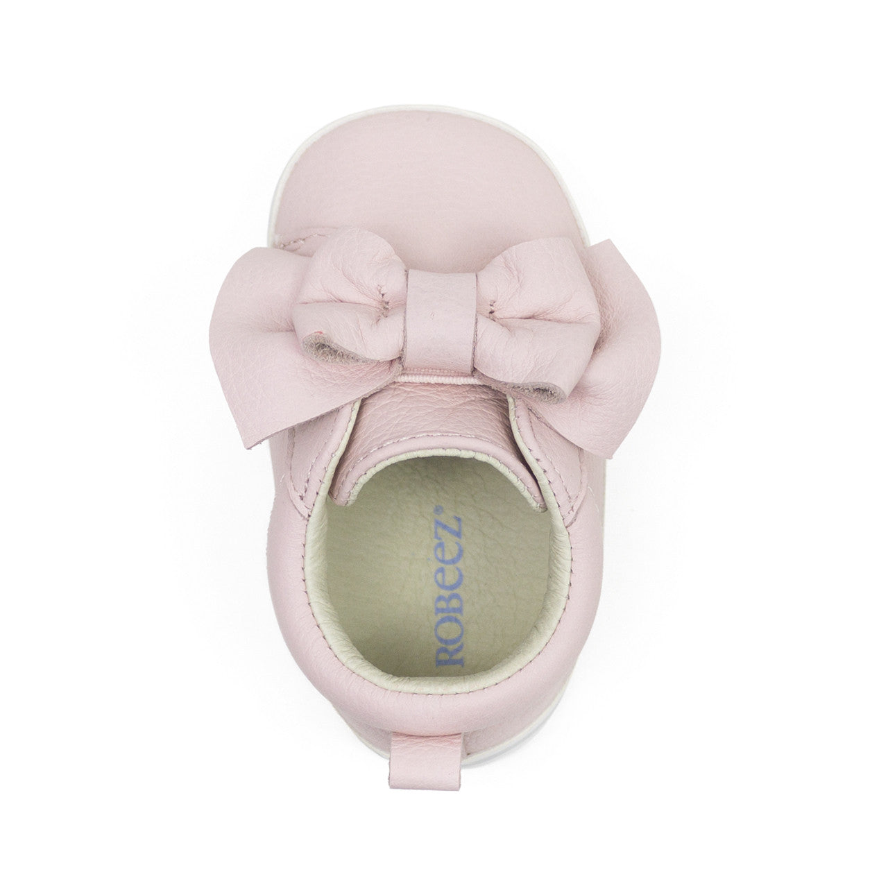 Get your little one stepping in style with these light pink toddler shoes. Made with high-quality genuine leather and soft, suede soles, these baby girl dress shoes offer the ultimate comfort and style. Each pair features a stylish structured design with a big pink leather bow at the top. A white leather strip runs along the heel that adds a little touch of chic.