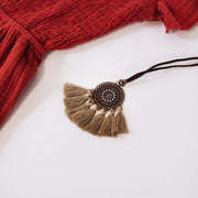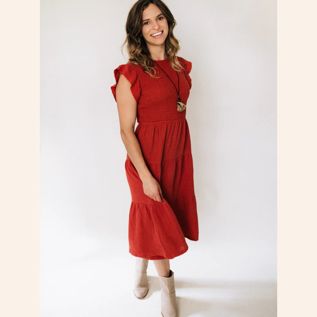 Matching mommy and me dresses that are sweet perfection for you and your little girl or baby. The knee-length dress boasts a shirred bust and back button enclosure, while the tiered skirt adds a playful touch. The stunning rusty copper red color is complemented by a beautiful boho necklace with tassels and adjustable rope cord, making it a complete and stylish outfit. The material is cotton crepe which is similar to muslin. After the first wash and tumble dry the material gets a soft and patterned texture. Fabric is 100% cotton.