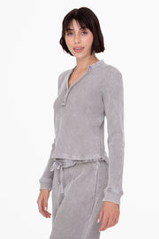 Our mineral-washed long-sleeve Henley style top is an effortless essential. The distressed details and vintage look give a bit of edge, while the waffle knit design and 100% cotton fabrication makes this top super soft. It's accented with a partial button placket on the front and has a comfortable boxy fit.