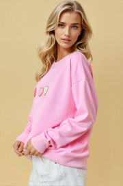 Be prepared for Valentine's Day with this charming crewneck featuring adorable chenille heart patches in multiple colors and accented with metallic gold trim. The soft, cozy sweatshirt material and ribbed cuffs on the long sleeves make it ideal for comfortable and stylish everyday wear. Made with 95% cotton and 5% spandex, it's the perfect addition to your wardrobe.