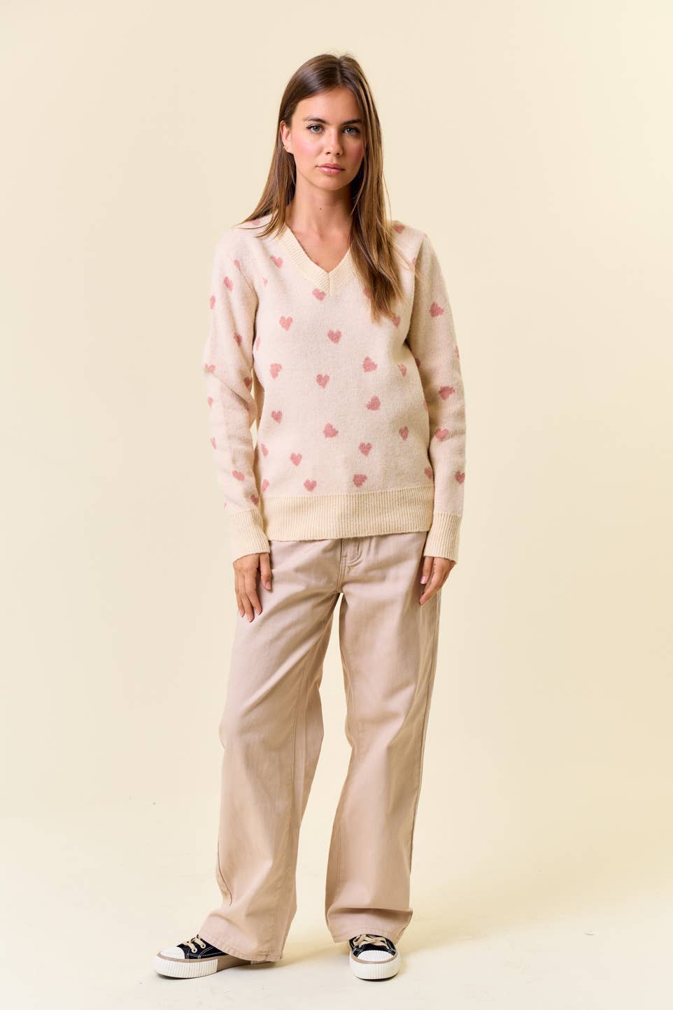 This V-neck knit sweater showcases a charming heart pattern design throughout, adding a lovely touch for the season of love. Featuring long sleeves with ribbed cuffs and intricate ribbed detailing on the hem and neckline, it is a perfect addition to your wardrobe this Valentine's Day.