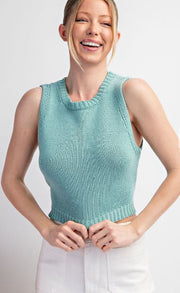 Introducing our Cropped Knit Tank Top, a must-have addition to any wardrobe. This sleeveless tank features a round neckline and a ribbed bottom band for a comfortable fit. Its cropped length and slightly fitted body create a stylish look that can easily be dressed up or down. Made from a soft knit material, this tank is sure to become your go-to for all occasions.
