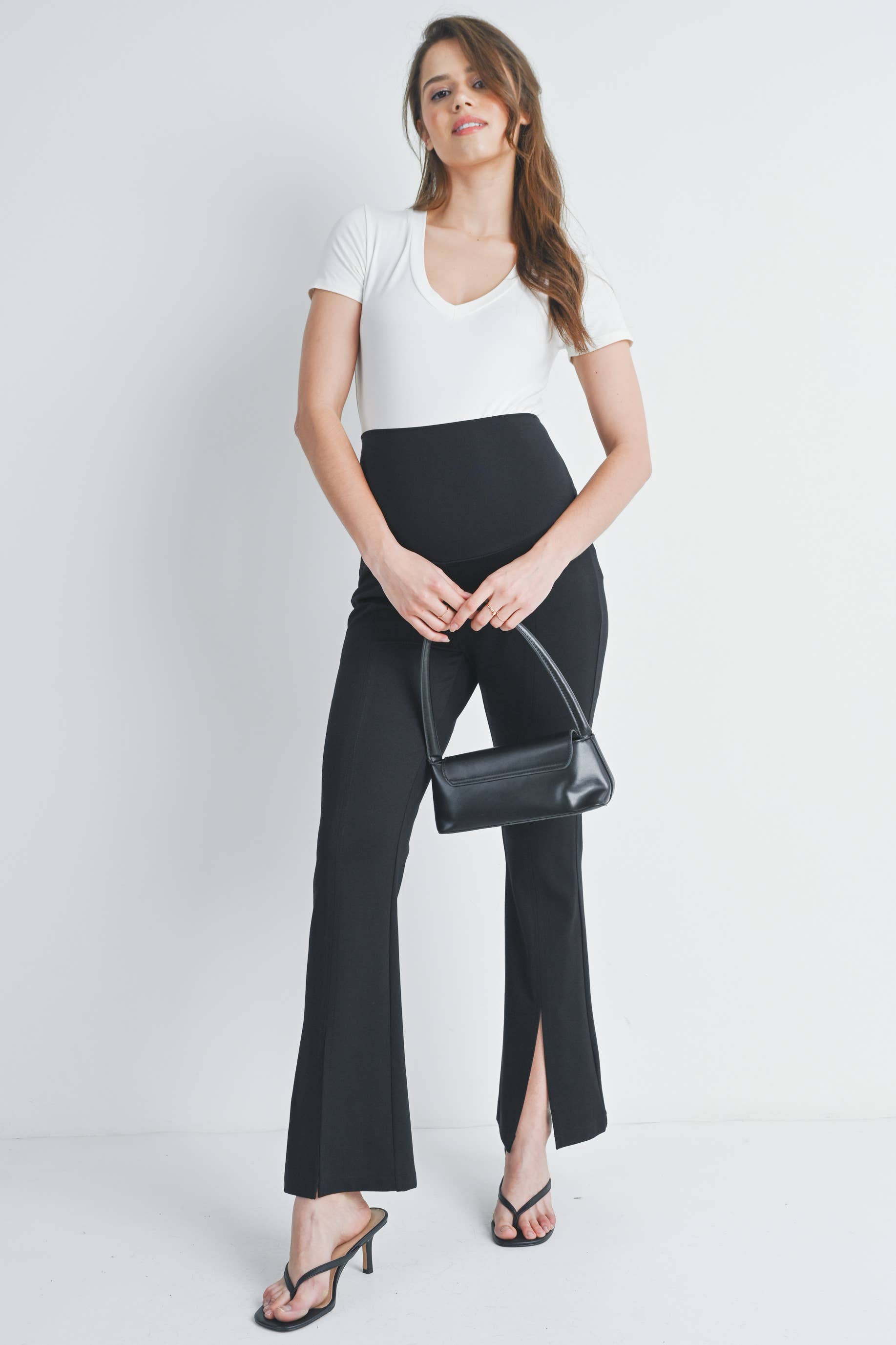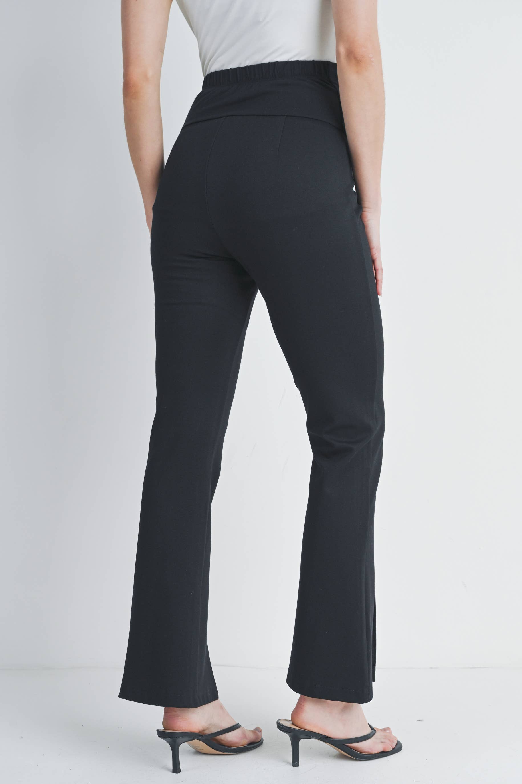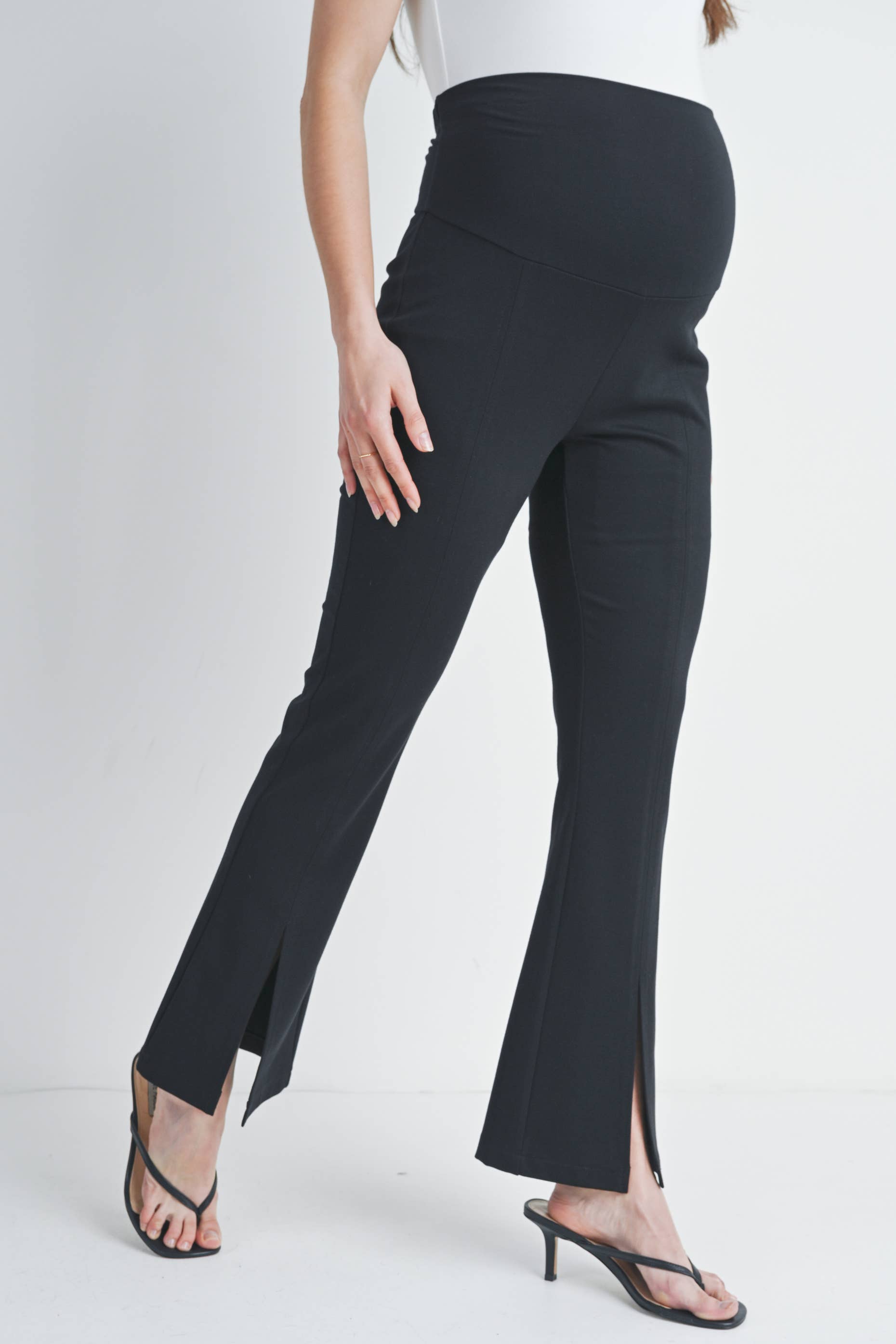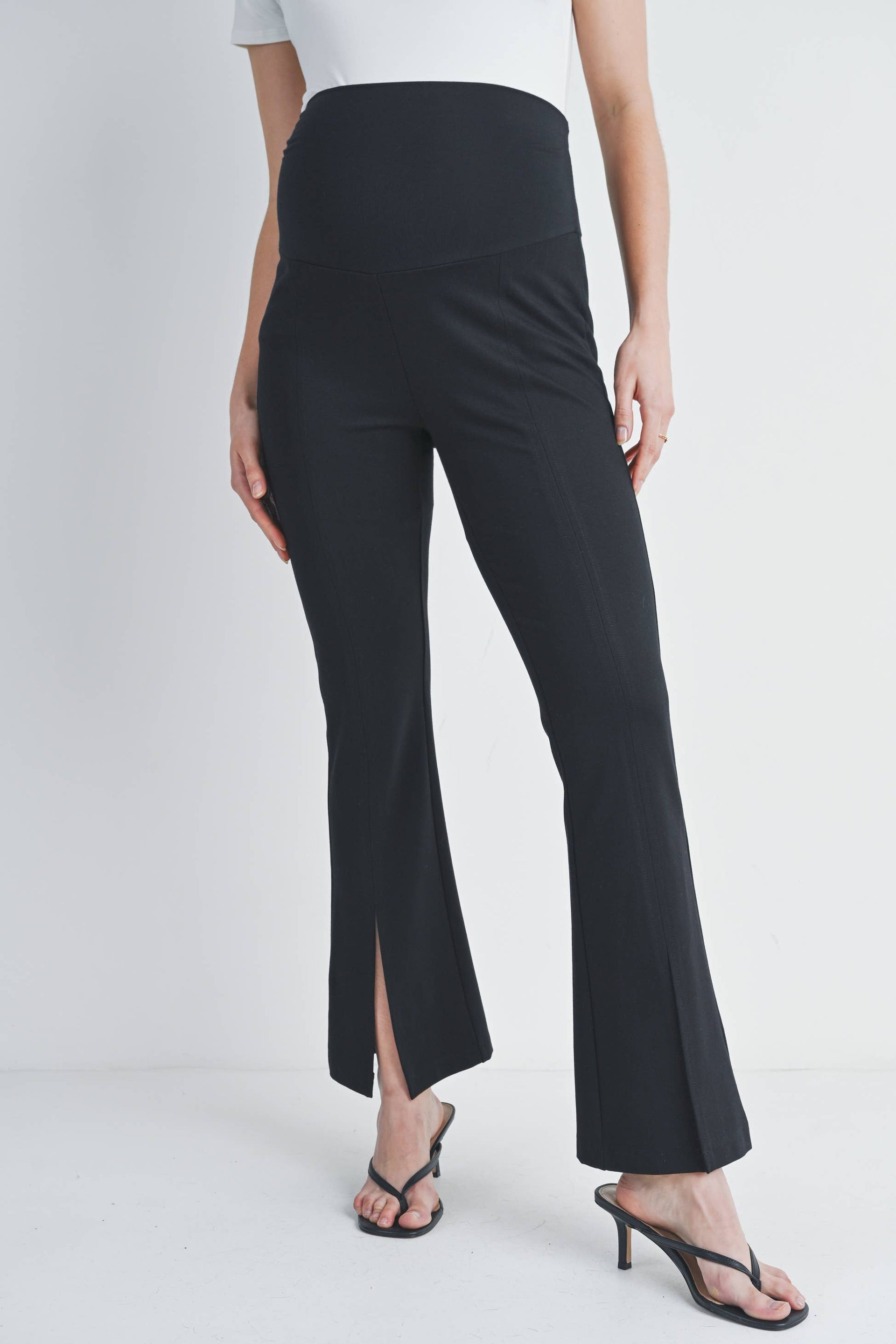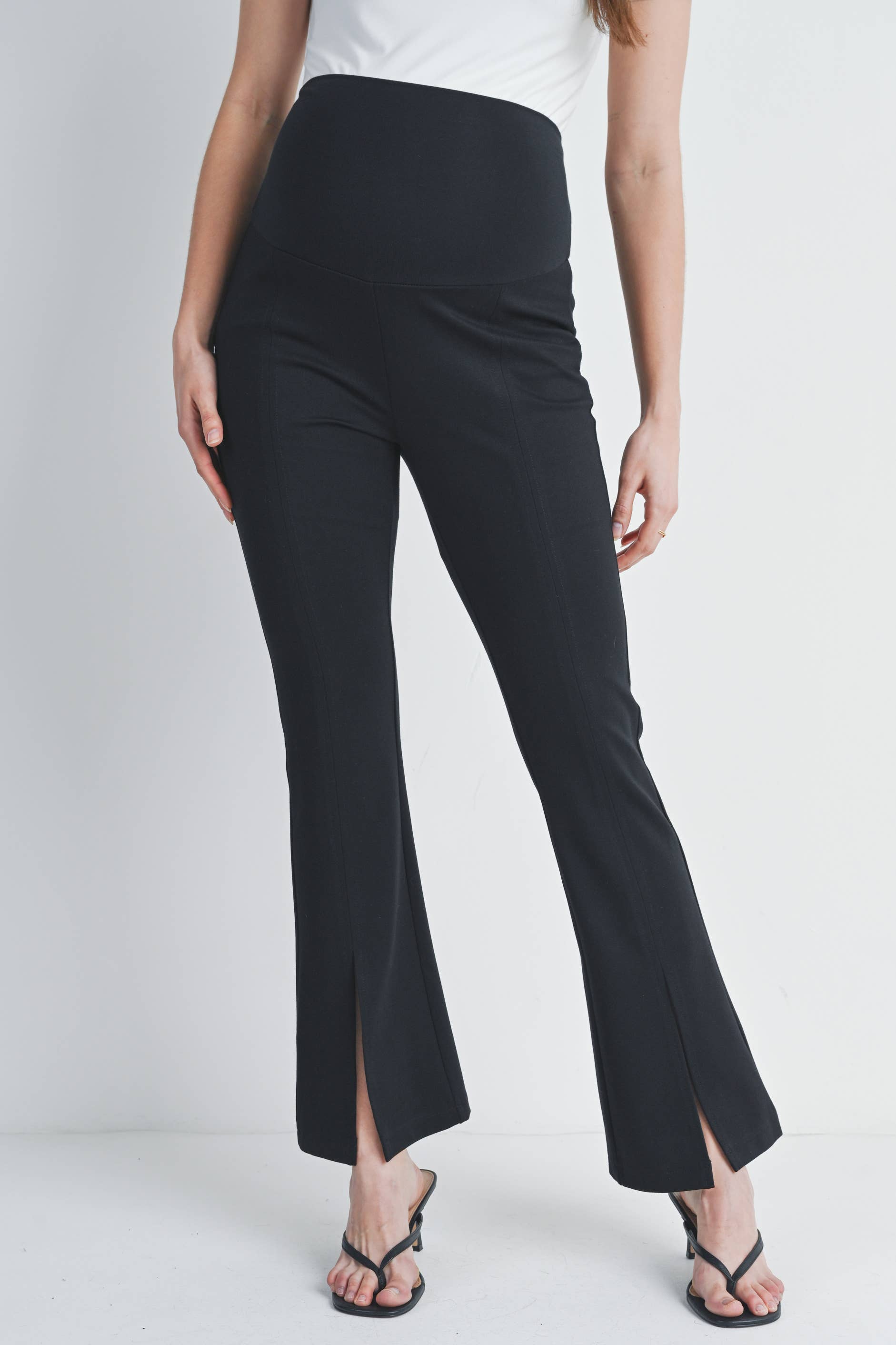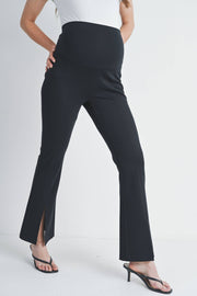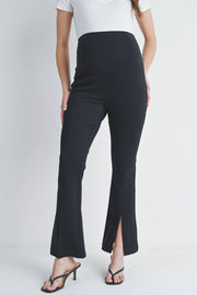 Bump-friendly style meets comfort in these Black Flared Maternity Over The Belly Pants. The wide, stretchy waistband sits securely over your growing belly while the flared silhouette flatters your changing shape. Crafted from a luxurious rayon modal blend with just the right amount of stretch, these ponte twill knit pants move with you through every trimester. The split hem adds a modern touch to this maternity essential. Available in size Small with a 30" inseam.