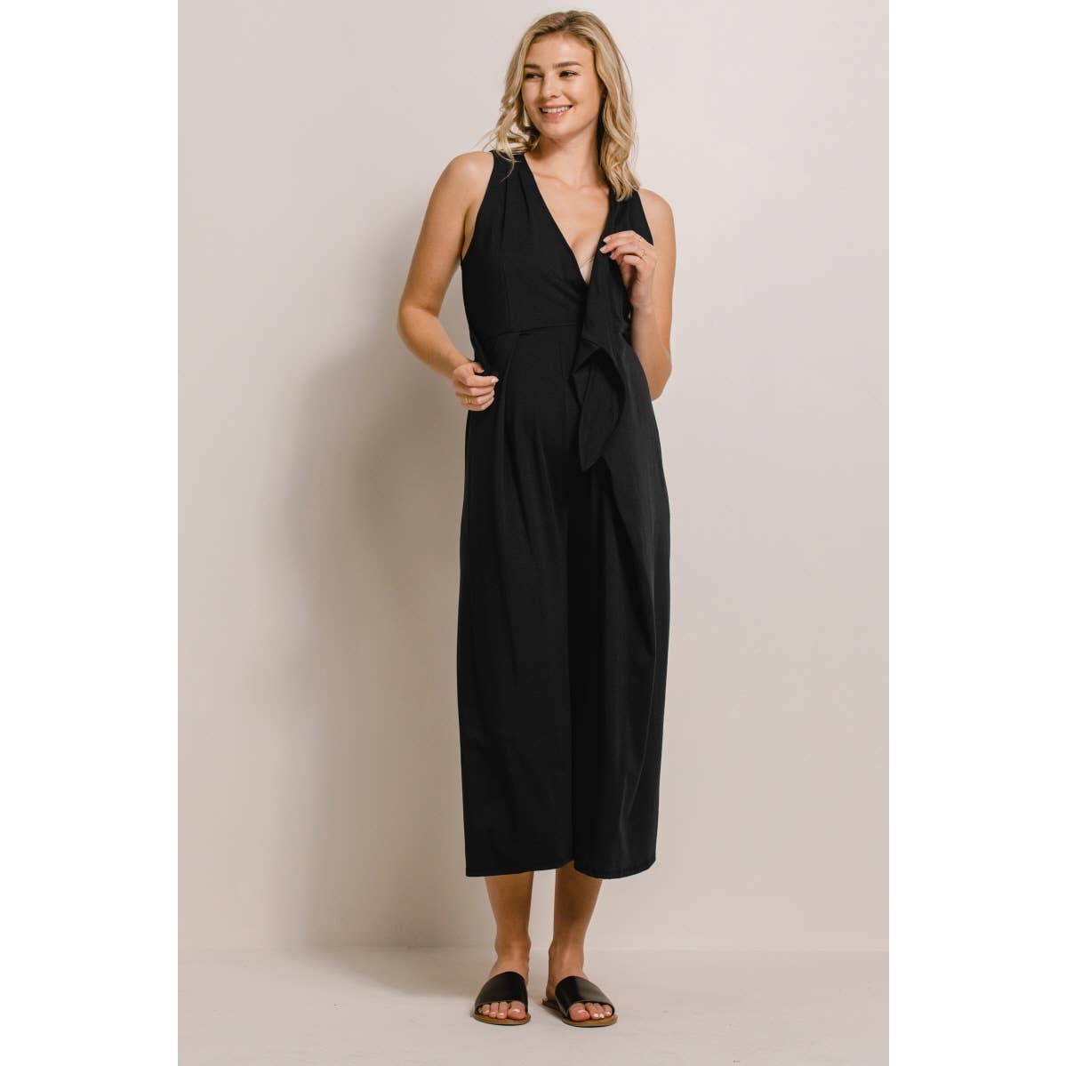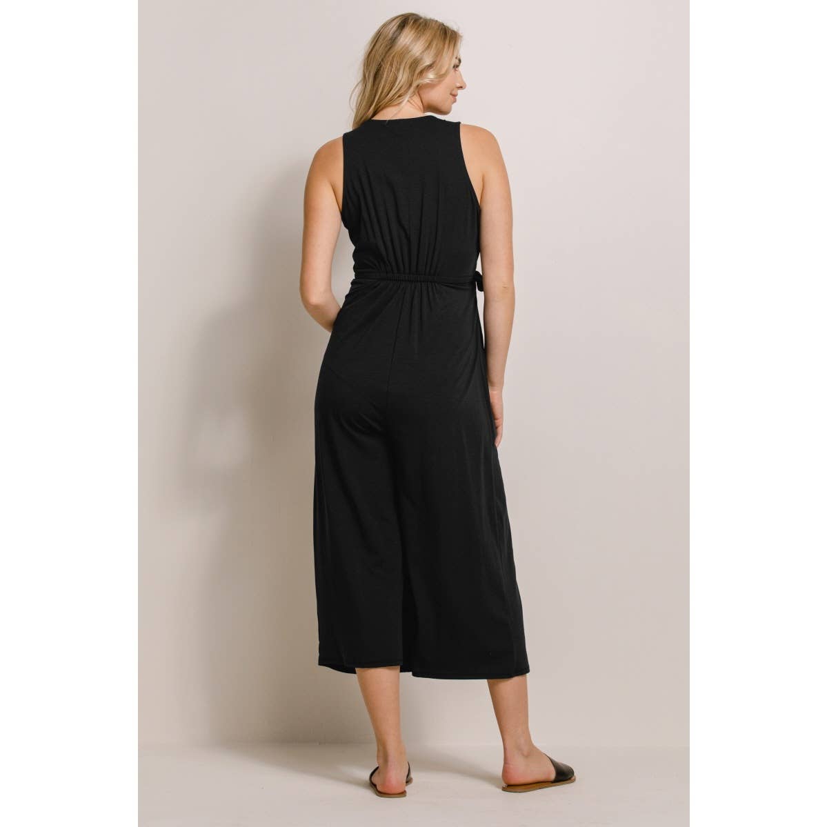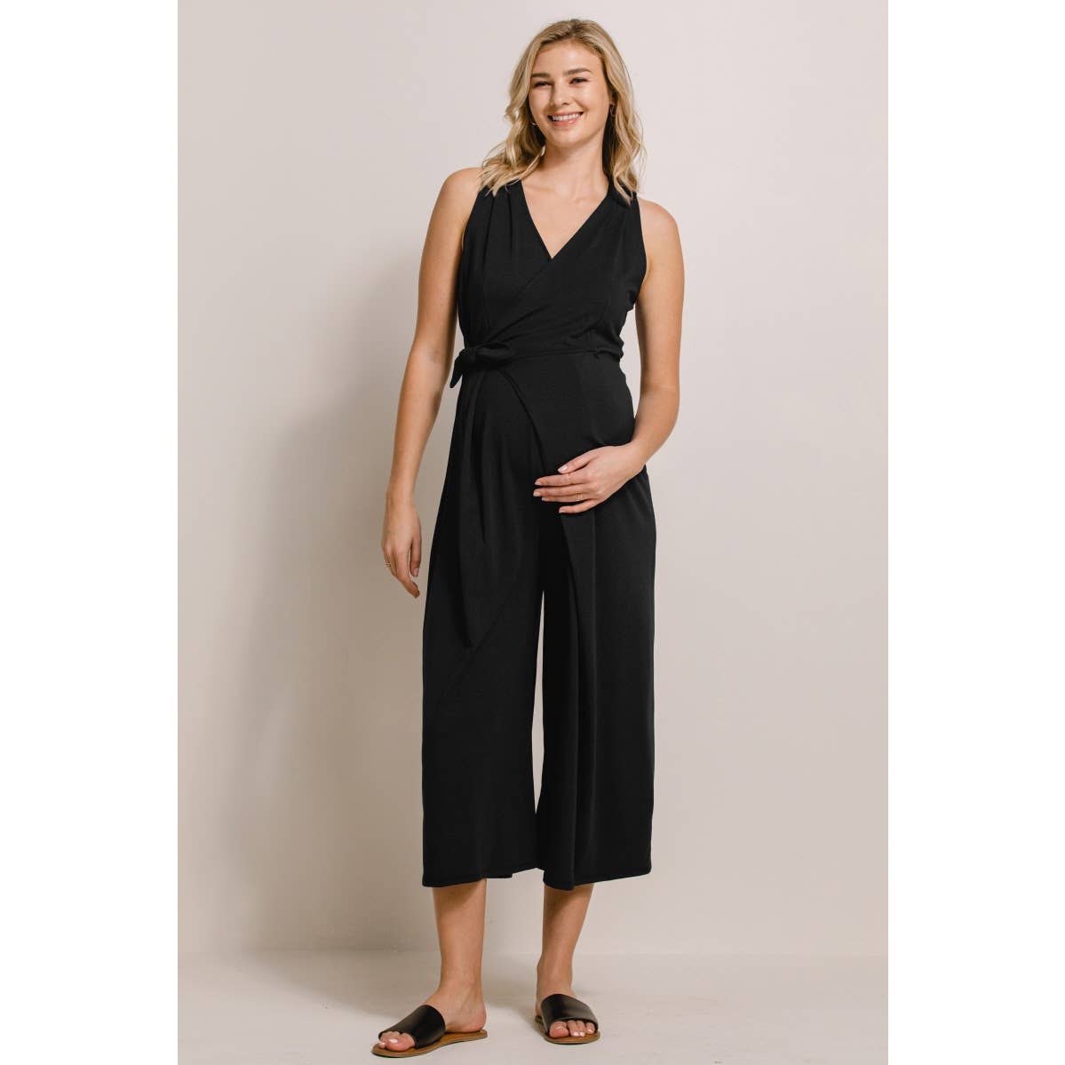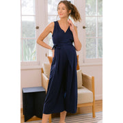 Effortlessly chic and oh-so-practical, this sleeveless surplice jumpsuit is designed for the modern mama. The flattering v-neckline and tie waist create a polished silhouette, while the wide-leg cropped cut keeps things comfortable through every stage. Nursing-friendly design means you can style it now and beyond. Crafted from a breathable viscose-cotton blend with just enough stretch, it's the one piece that works as hard as you do. Machine wash cold, lay flat to dry—easy care for busy days.