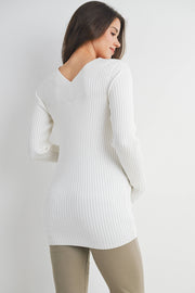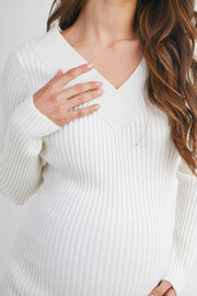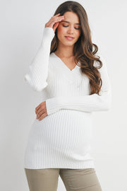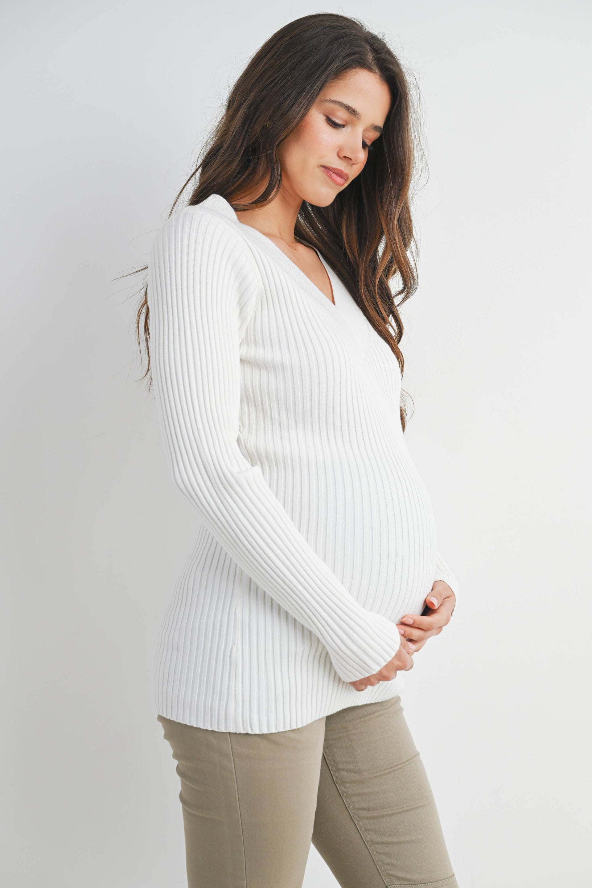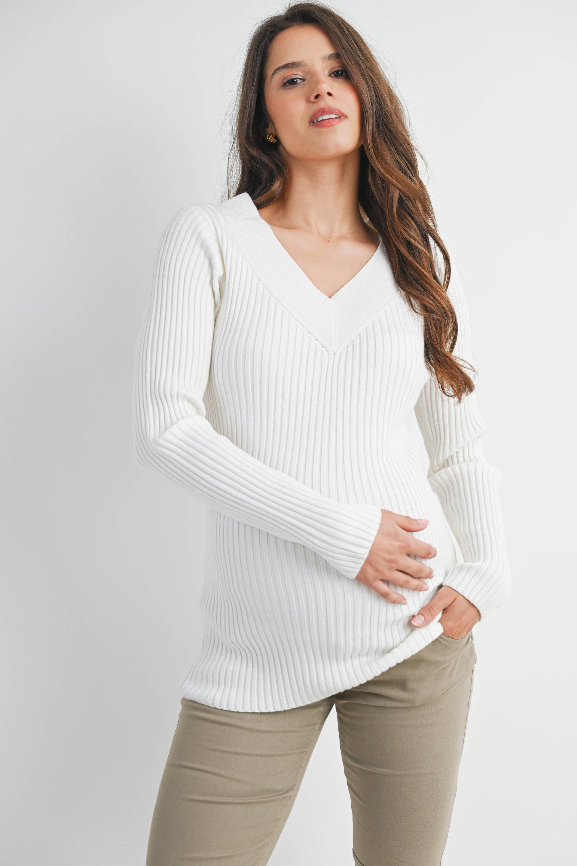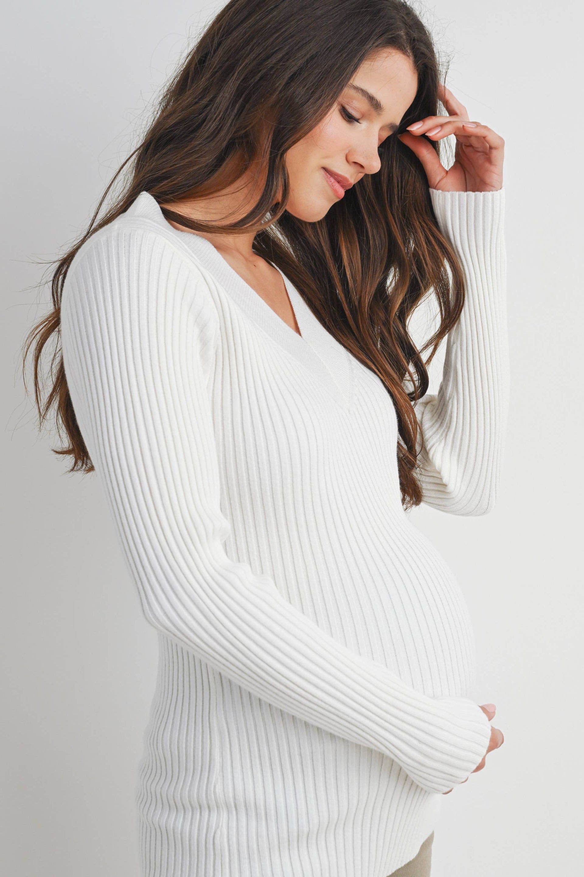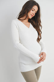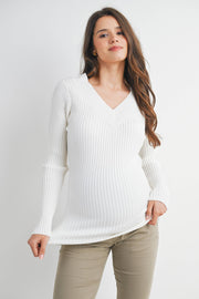 Embrace comfort and style during pregnancy with this ribbed V-neck pullover sweater. Crafted from a luxurious blend of viscose, polyester, and nylon, it offers a flattering fit that grows with you. The long sleeves and classic pullover design make it perfect for layering through every trimester. Easy care—simply hand wash in cold water and hang dry for lasting softness and shape.
