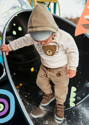 Designed for maximum comfort and durability, these Baby Fleece Pants feature bear pockets on front and back, an elasticated waistband with an adjustable drawstring to ensure a secure fit. Reinforced internal knee pads protect against wear, extending the life of the pants during active play. Elasticated hems provide a snug fit around the ankles, while functional front and back pockets add practicality. Decorative appliqued ears, embroidery, and print details lend a charming touch without compromising functionality. Ideal for keeping your baby comfortable and protected throughout the day.